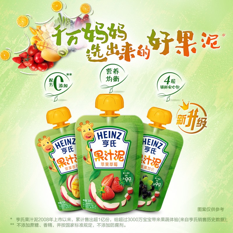 亨氏是来自美国的婴儿食品品牌,1869年在夏普斯堡创立。亨氏的产品有5700多种,除了人们熟知的婴儿米粉外,还有番茄酱、调味品、沙司和冷冻食品等。亨氏乐维滋果汁泥配方新升级,真材实料0添加,不添加香精、白砂糖、色素以及防腐剂。严格控制原料产地,运用专业的巴氏杀菌工艺,无需添加防腐剂,也能保留营养成分。为避免异物卡喉,经过了精细的硏磨,质地细腻,入口更安心。使用四层复合锁鲜膜,无防腐剂也能保鲜,品质更放心。