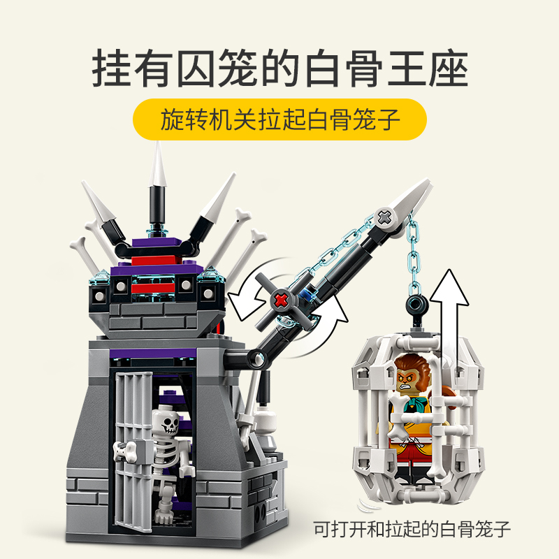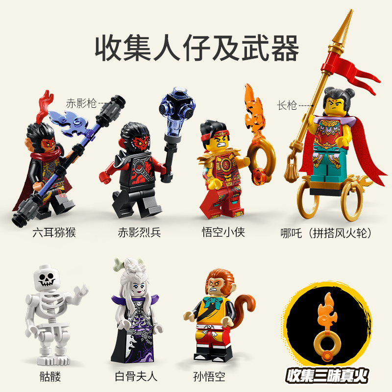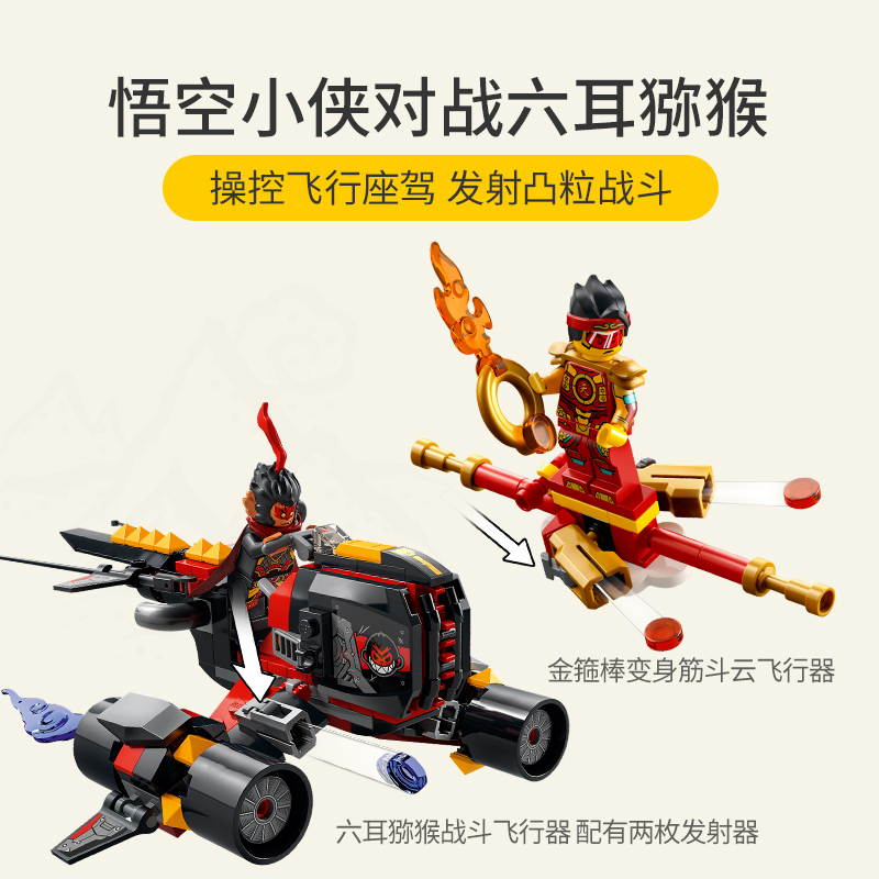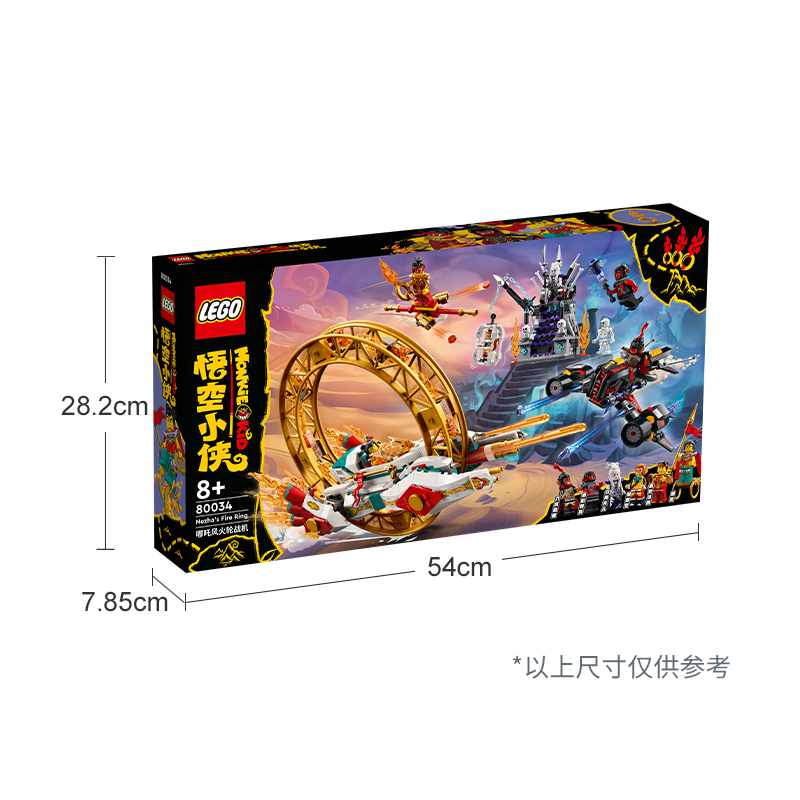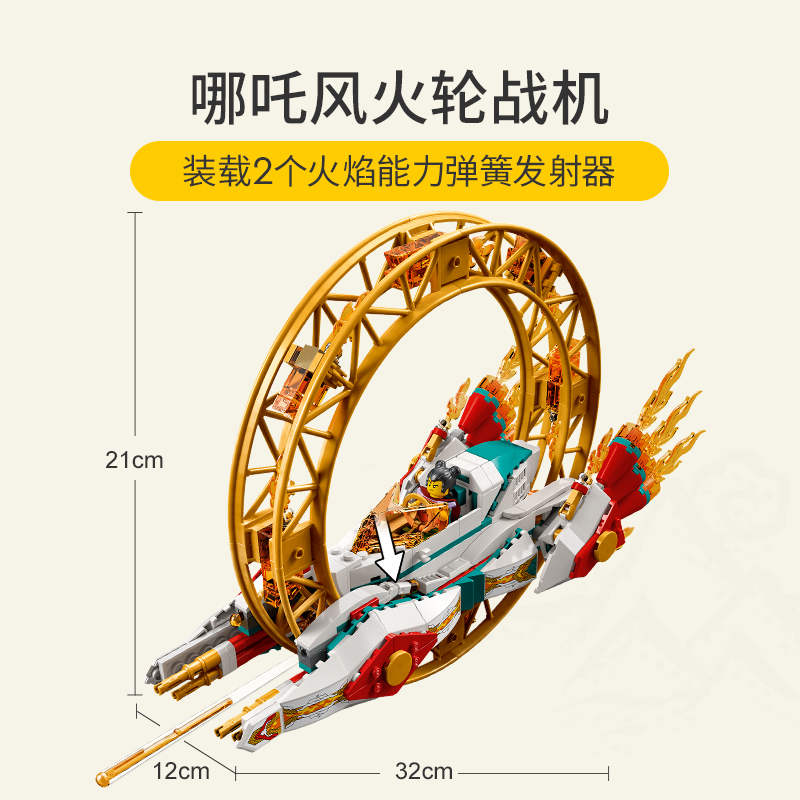 哪吒风火轮战机(80034)属于悟空小侠系列积木套组,整个套组包含 929 个积木颗粒。乐高LEGO 80034 首发于2022年。本套装包含哪吒的风火轮战机(配有 2 个火焰高能发射器)、六耳猕猴的喷气式飞机(配有凸粒发射器)、悟空小侠的金箍棒飞行器,以及白骨夫人的王座,其配有悬挂式白骨笼子和囚室。共包含 6 个小人仔(其中包括悟空小侠,身穿于 2022 年 1 月新推出的战甲),以及各式武器和配件,如哪吒的长枪和可以拼接的风火轮。