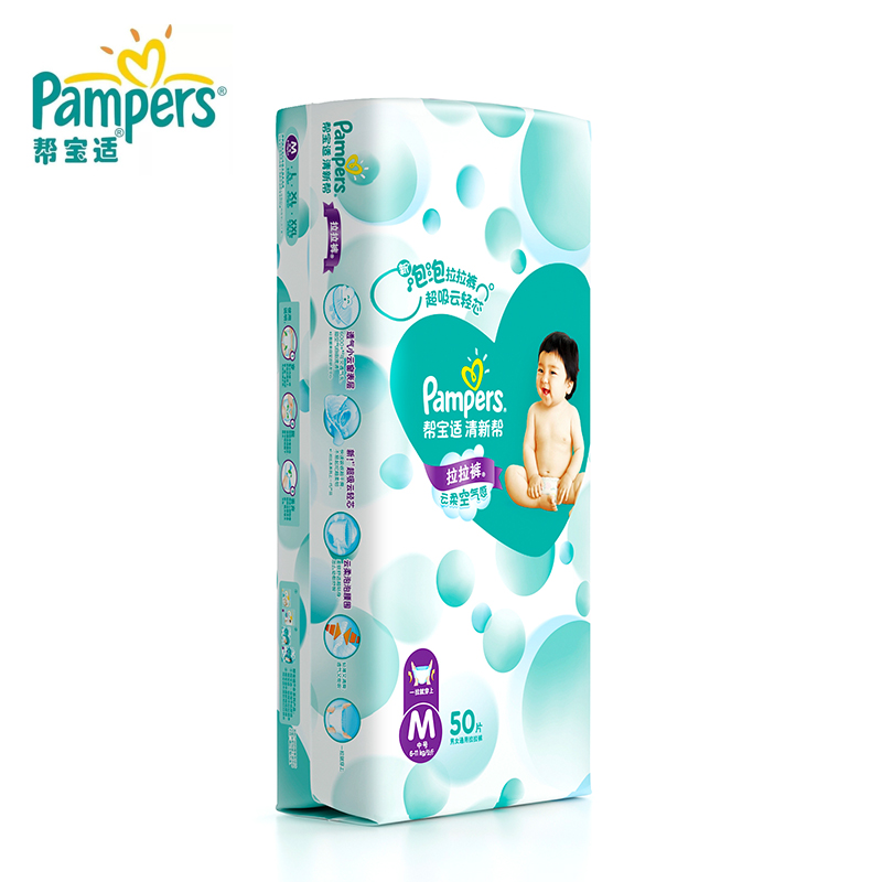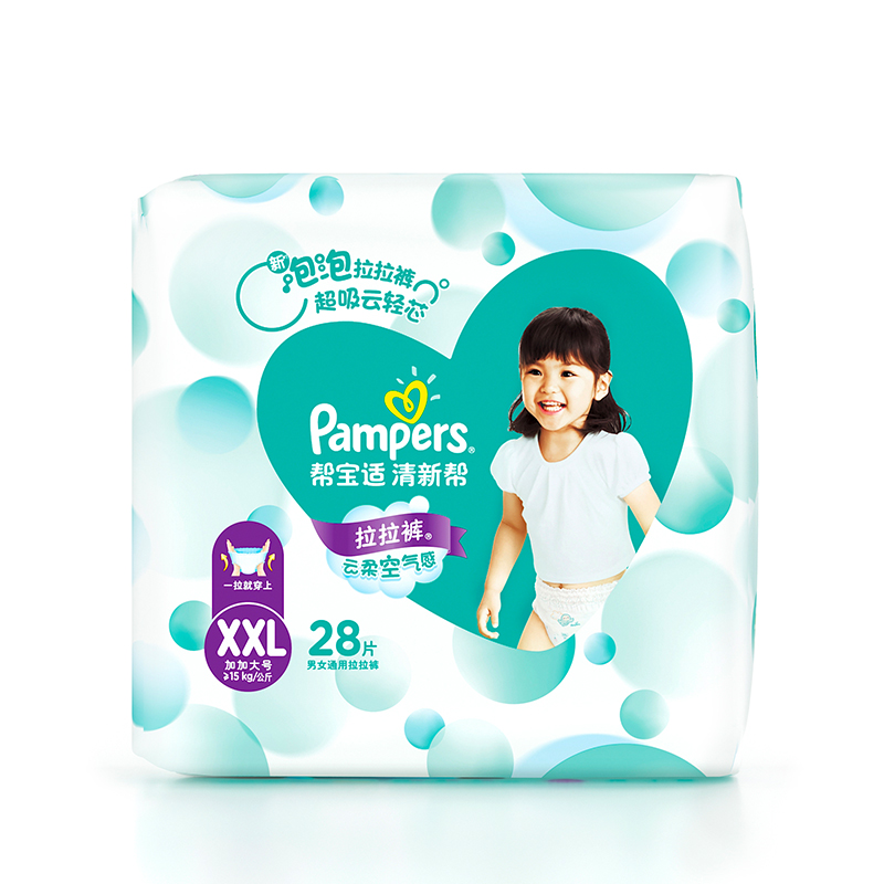 Pampers帮宝适是宝洁旗下婴儿用品品牌,为每个成长阶段的宝宝打造了不同纸尿裤,包括特级棉柔纸尿裤、超薄干爽纸尿裤和轻松穿拉拉裤。这款干爽系列拉拉裤,全弹力腰围设计。帮宝适旗下纸尿裤最新系列——清新帮,采用云柔泡泡透气层设计,不闷热,云触感材质,柔软如云朵。高分子吸水珠珠,瞬吸干爽,轻盈柔韧芯体,自在随心动。收口采用透气小云窗表层,6000+呼吸孔赶走闷热,云触表层透软亲肤,透气干爽长达12小时,特有S曲线侧腰围,不易摩擦,不勒肉。