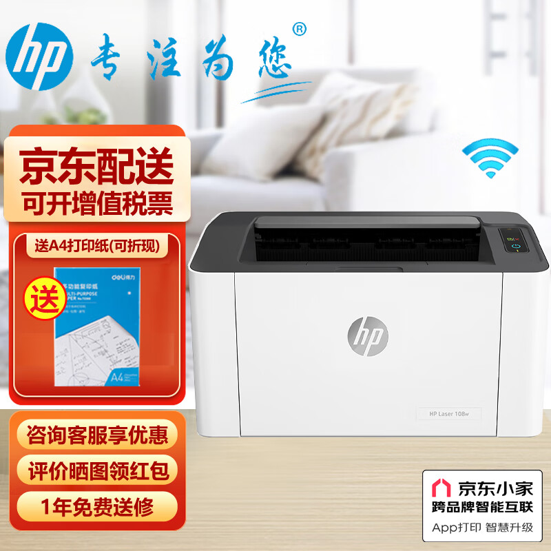 这款打印机是惠普于2019年5月份,推出的激光打印设备、它是经典机型P1106的升级型号,其延续了惠普打印机的经典白色外观,并将体积压缩至331*178*215mm,整体来看精致小巧。机身顶部右侧打造了简单的操作面板,使用起来也比较方便。这款机型为黑白激光打印机,这款机型的最大打印尺寸为A4,月打印负荷为10000页,108w在USB连接的基础上还支持Wi-Fi连接等连接方式。 性能方面,这款机型的首页输出时间为8.3秒,打印速度为20页/分钟,使用HP 110A原装黑色硒鼓,硒鼓容量为1500页。 使用HP Smart 可轻松实现移动智能打印,同时支持实时监控耗材余量,直观了解打印量。进一步优化了进纸纸路和加热组件设计,避免了卡纸的发生。采用接触式供粉,输出文件色调均匀,打印图像清晰流畅,支持各种介质打印。