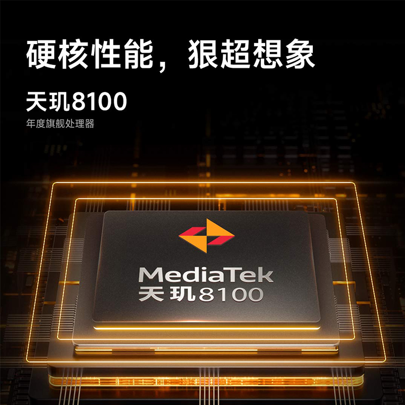 配置方面,搭载联发科 天玑8100 5nm制程处理器,全新架构,性能强大的同时兼顾功耗。散热方面,采用新一代T型不锈钢VC,覆盖主板72%区域,带来VC液冷散热面积,搭配7层石墨立体均温,散热能力大幅度提升。续航方面,5500mAh大电量电池搭配67W快充。拍摄方面,后置摄像头采用索尼48MP像素主摄,支持OIS光学防抖;800万超广角摄像头;200万微距摄像头。前置摄像头则采用2000万摄像头。支持快拍功能,AI相机。支持WIFI 6 160MHz,蓝牙5.3。杜比立体声扬声器。X线性马达。支持红外功能。IP53防水防尘。共有8GB+128GB、8GB+256GB、12GB+256GB三个版本可选。
