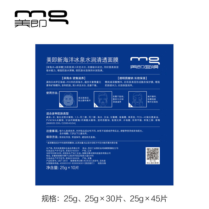 美即面膜里这款海洋冰泉补水面膜的补水效果不错,用后脸部比较滋润,而且能一定程度上提亮肤色,用后易于上妆。