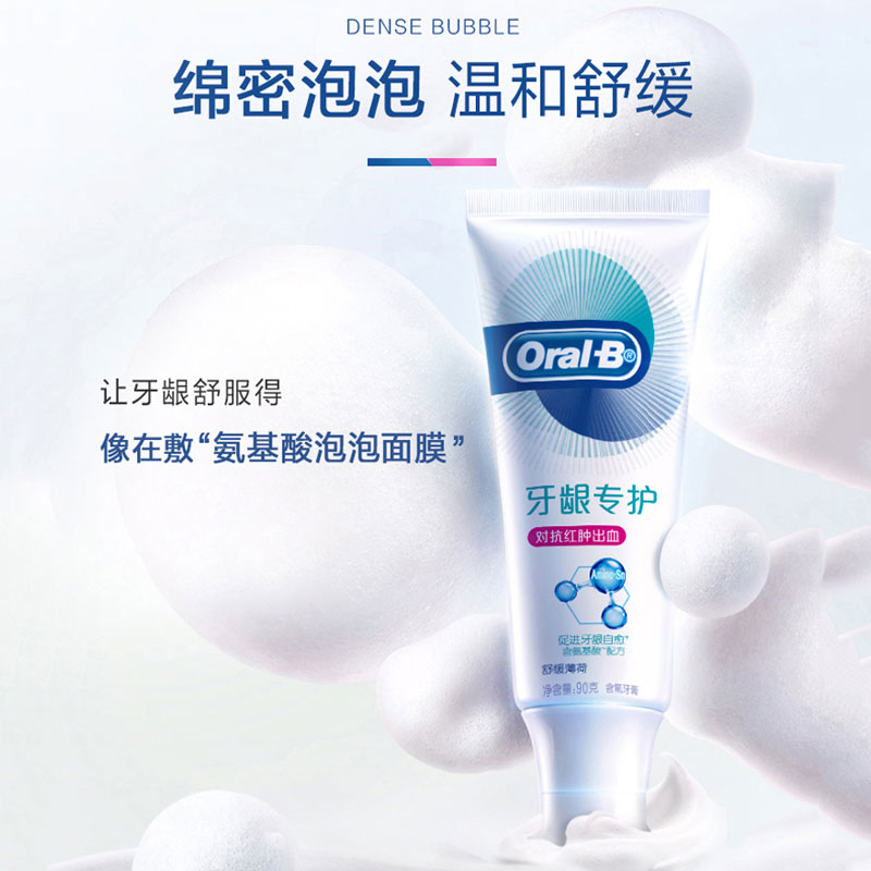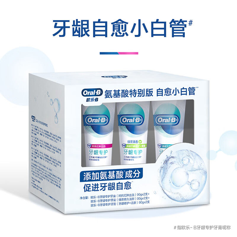 Oral-B(欧乐-B)是美国知名日用品公司宝洁公司旗下品牌。这款欧乐-B 牙龈专护牙膏 3支套装,采用氨基酸配方,帮助微米级护龈因子,有效清洁牙龈沟。促进牙龈自愈,修护牙齿,快速减少红肿出血,绵密泡泡温和舒缓持久清新。包含对抗牙龈红肿出血牙膏140g、持续牙龈修护+清新牙膏 90g、夜间对抗牙龈出血红肿 90g。