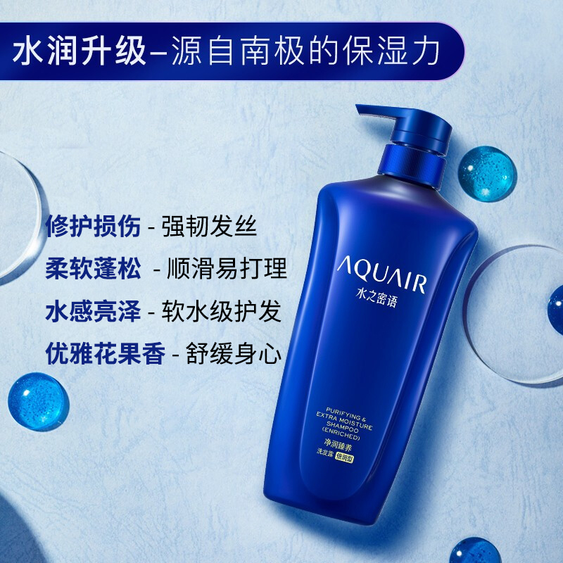南极海洋蛋白,为干枯秀发及头皮提供源源水润,带来满满呵护。多效凝水臻护成分修护受损,锁住水分,改善头皮水油平衡,令秀发远离干枯毛躁,柔亮润泽。