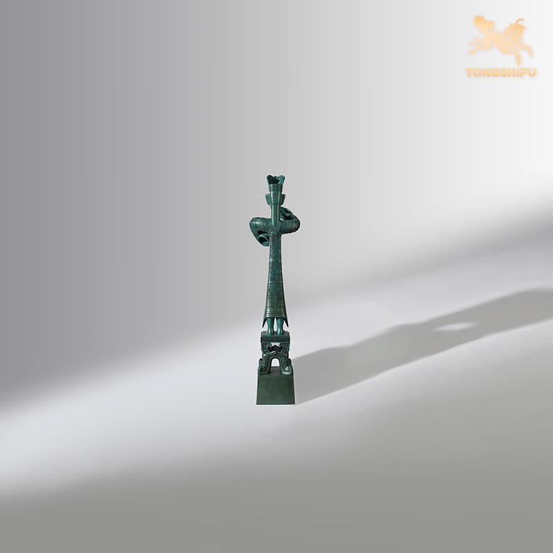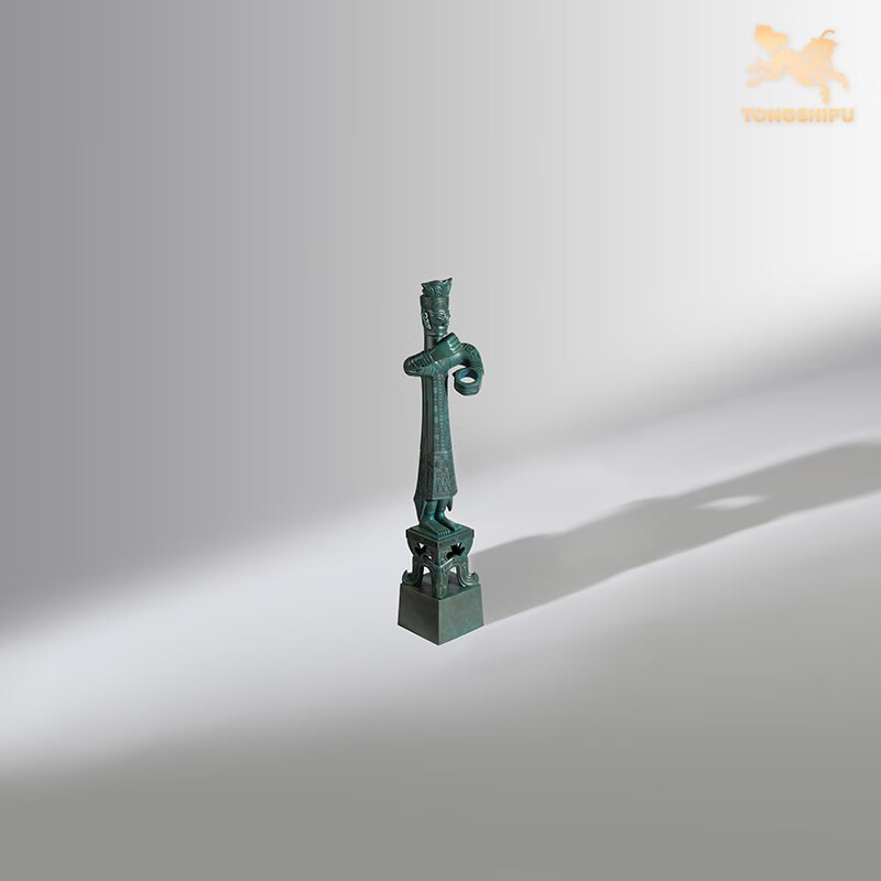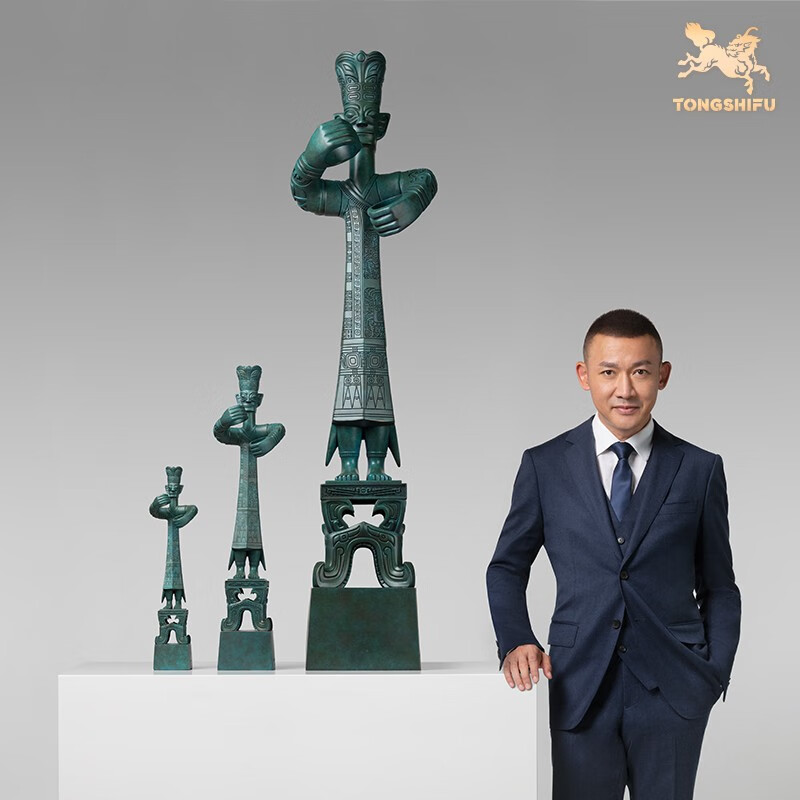 青铜立人像,堪称三星堆青铜雕像中的“领袖”人物,人像头戴高冠,衣上纹饰繁复精丽,以龙纹为主,辅配鸟纹、虫纹和目纹等,身佩方格纹带饰, 脚戴足镯,赤足站立于方形神座之上,其双手环握中空,典重庄严,看似一位通天异禀、神威赫赫的大人物。