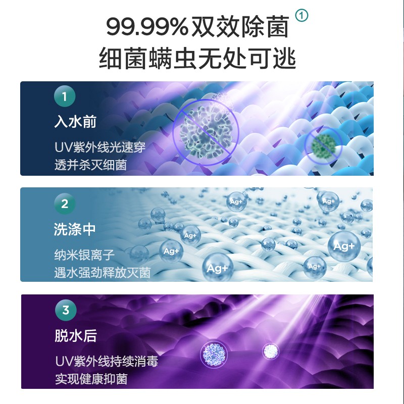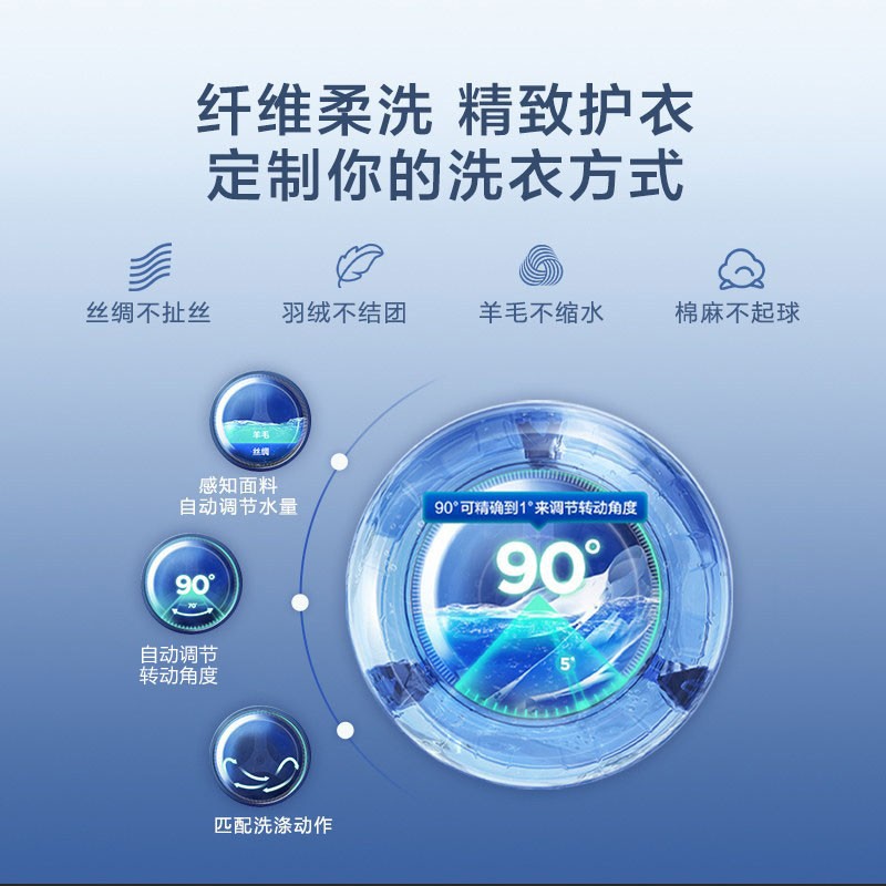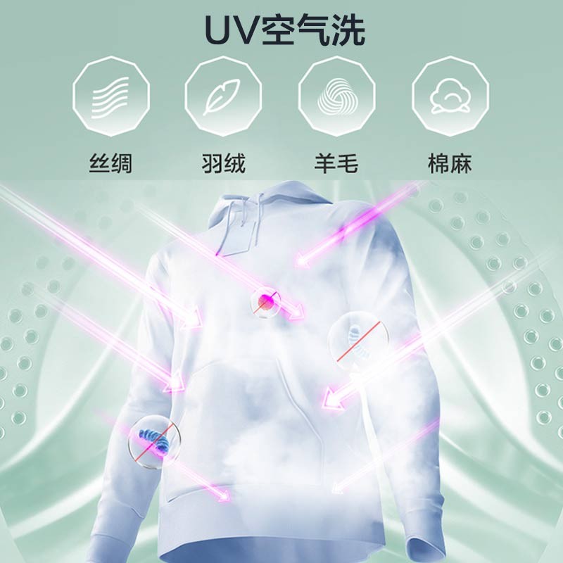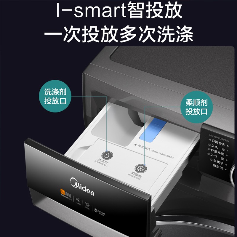 美的(Midea)这款型号为MD100CQ9PRO的滚筒,其兼具洗涤以及烘干两种功能,洗涤10公斤,烘干7公斤,是一款洗烘一体机。其仍然属于新爱尚系列,同样采用了东芝的DD直驱变频电机,动力强劲且运行声噪低。为保护衣物,带有纤维柔洗功能,可为不同面料不同材质,自动匹配洗涤转速以及停转比。内置UV灯,可有效进行杀菌除螨。为方便使用,带有I-Smart智能投,误差维持在±1毫升之间。自带多达11种洗烘程序,满足多样使用需求。
