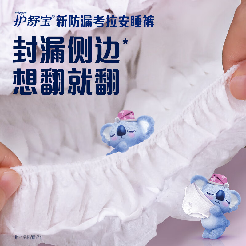 这款whisper 护舒宝 考拉裤裤是专为夜间设计的裤型卫生巾,内裤型的设计,像穿普通内裤一样轻松舒适,绵柔表层,贴身轻薄,360°透气孔 ,不惧闷热。