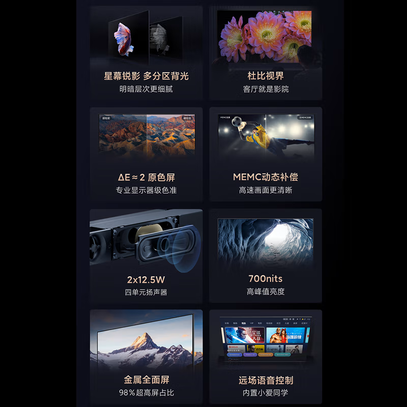音响系统由双通道12.5W功率的四单元音响组成,支持立体声播放,每个通道单独配备了低频和高频扬声器,让高频的人声和低频的背景声分离,使声音听上去更有层次。支持远场语音控制,内置小爱同学,无需遥控器,一句话就能点播内容。兼容主流投屏协议,不仅支持安卓、iOS平台的手机投屏,同时还支持Windows、Mac OS操作系统的笔记本投屏。具备97%超高屏占比,全金属边框,精致拉丝工艺,配合结构平衡设计的金属底座,让电视本身成为一件工业艺术品,百看不厌。