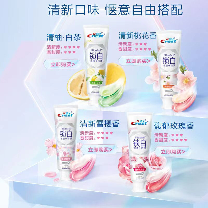 佳洁士这款全新双色锁白牙膏,在1亿抛光粒子的基础上新增了「色素隔离盾」,去渍更防渍,帮助抵御常见色素沉积,对比佳洁士普通牙膏,使用后牙齿持久亮白不染色。在颜值上也是提升了不止一个level,渐变双色透闪膏体,搭配清甜沁脾的香味,增加刷牙时的舒适感,持久清新口气。
