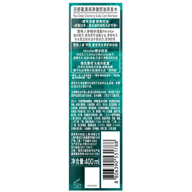 这款Ryo吕 舒盈清润系列舒盈清润净撤控油洗发水,吕是韩国爱茉莉集团的中高端洗护品牌,所有洗护系列均以汉为基础,具有防脱发功效。这款绿色瓶装的绿吕是由老款蓝吕和绿吕配方升级,合并而来。主打去屑滋养,镇定头皮和控油的特点,适合油性发质使用。