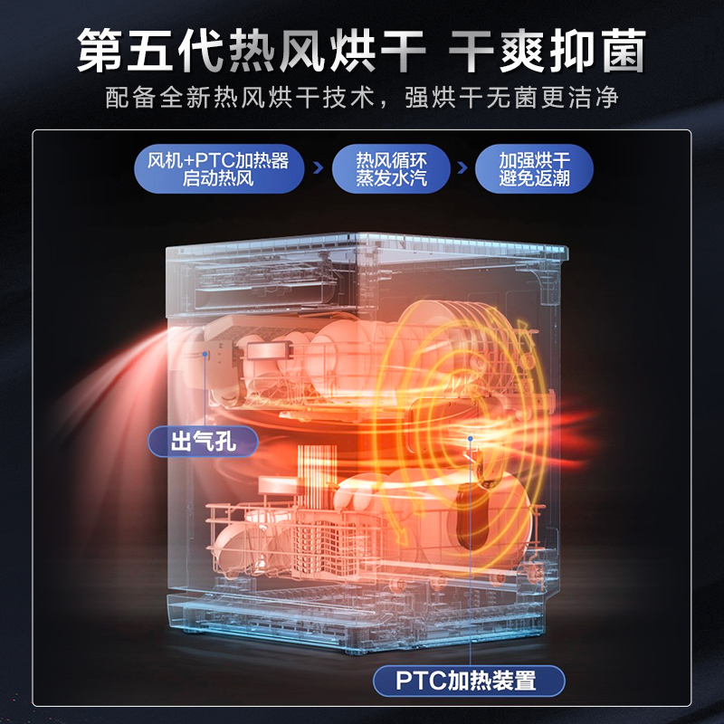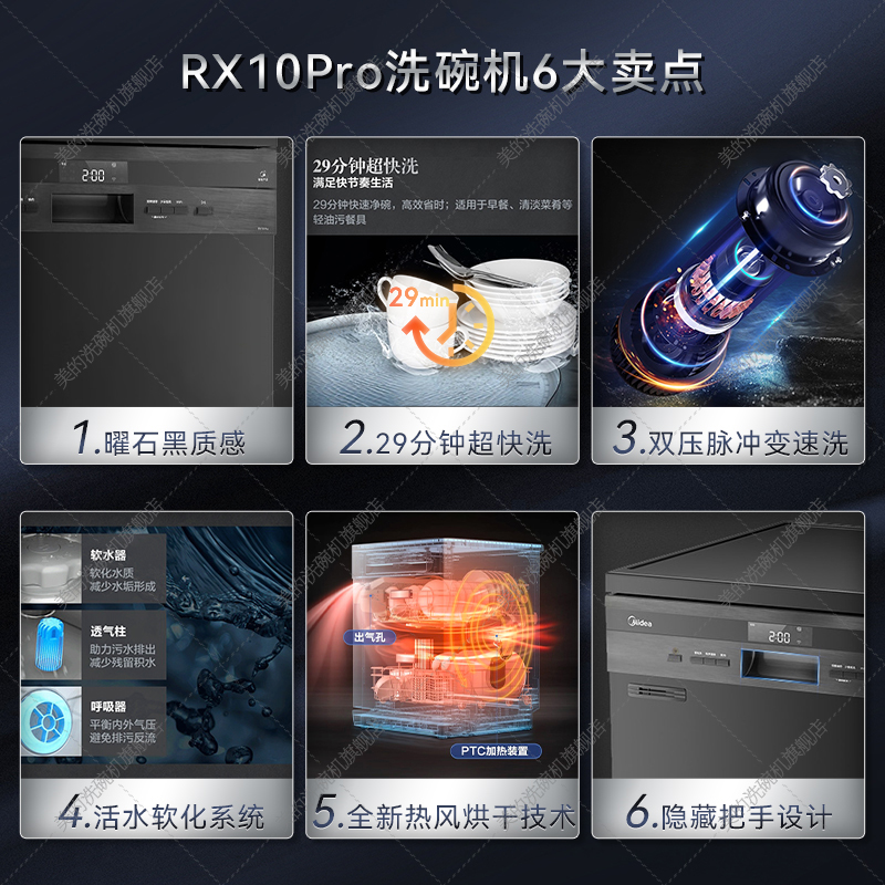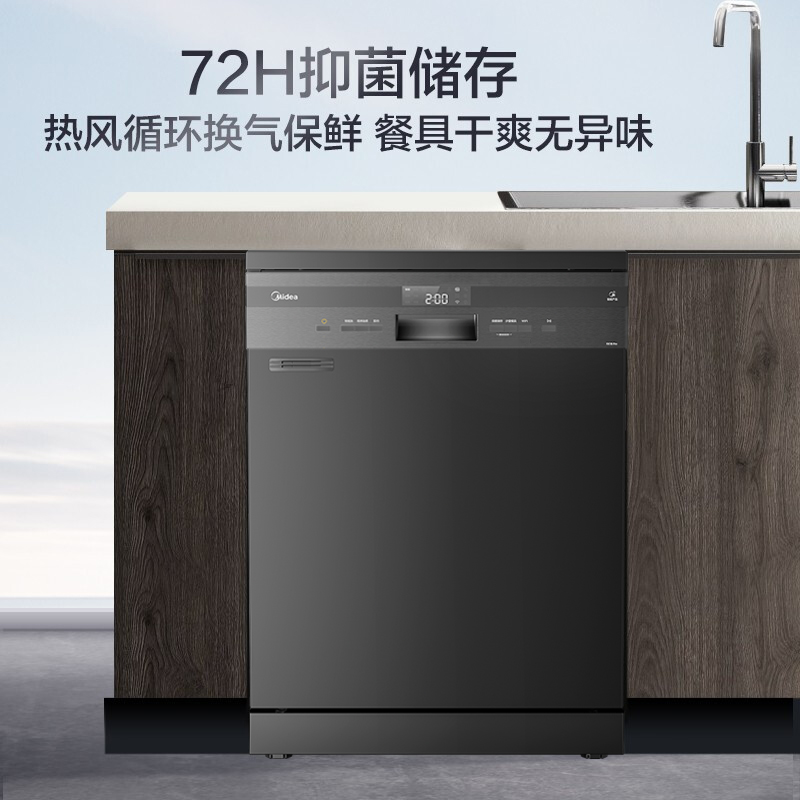 美的 RX10PRO 嵌入式洗碗机容量为14套(新国标)。曜石黑机身沉稳大气,隐藏式把手设计,整体更加一体化,避免磕碰,配备了全新的热风烘干技术,在原有的热风技术上升级可叠加1-2个时序的热风烘干,无菌更洁净。针对中国厨房研制,775mm可以自由嵌入中式橱柜。双压脉冲变速洗,根据不同模式精准控制水压,9+2种洗涤程序,72小时长效贮存,支持手机APP控制。产品尺寸:597*601*806mm。