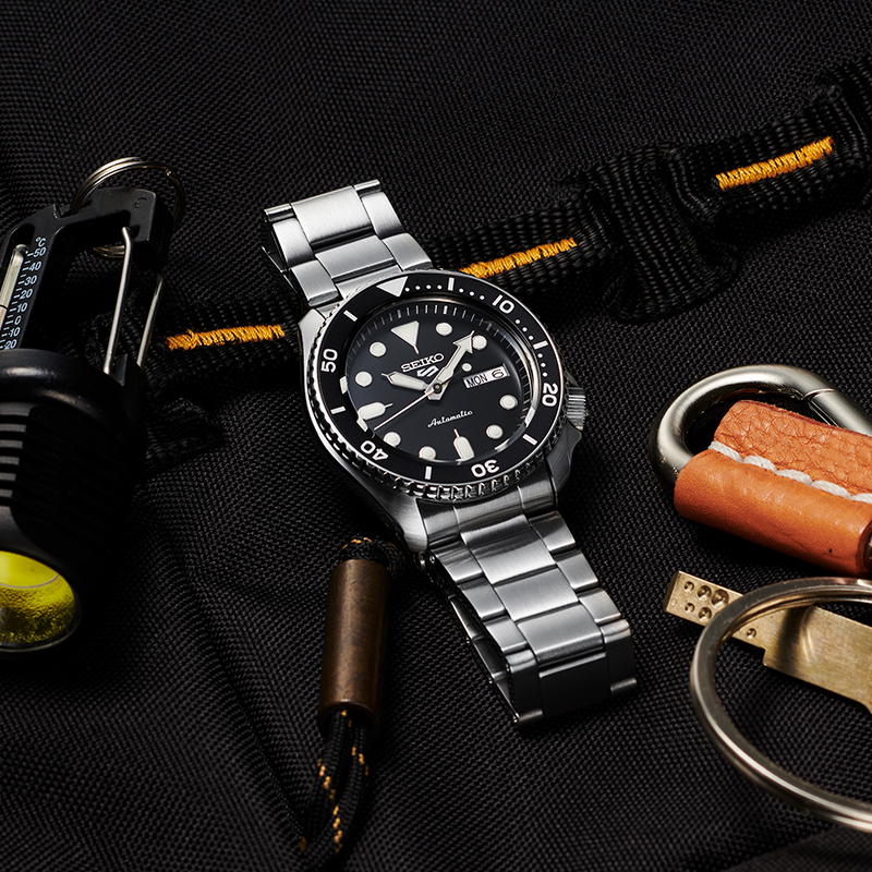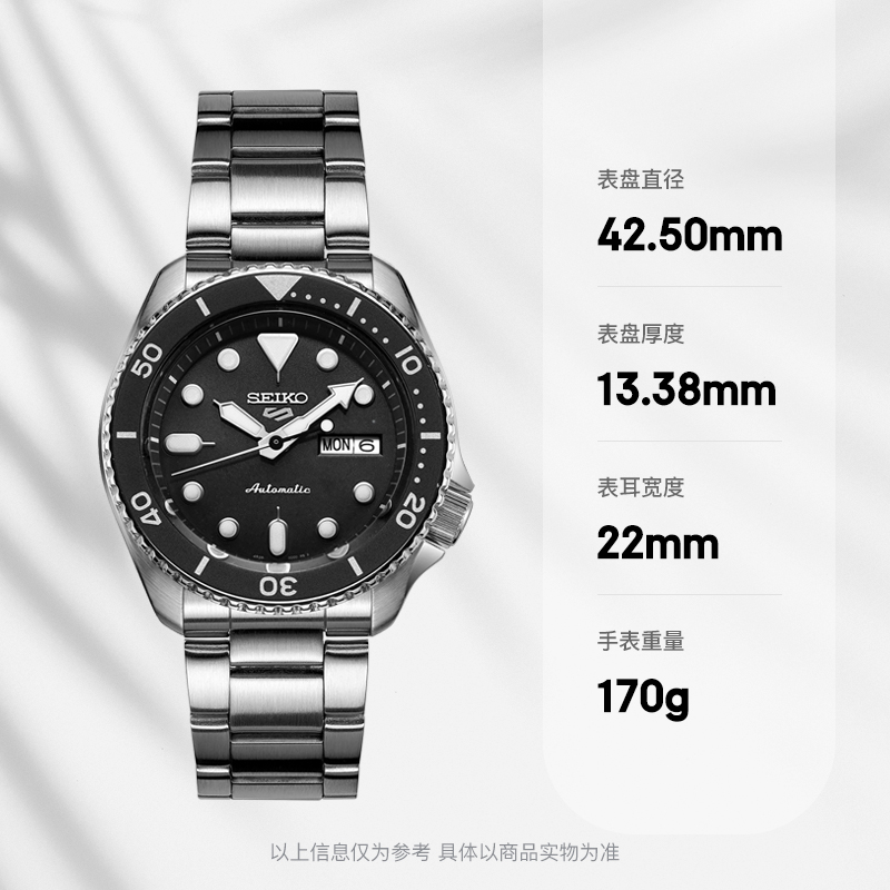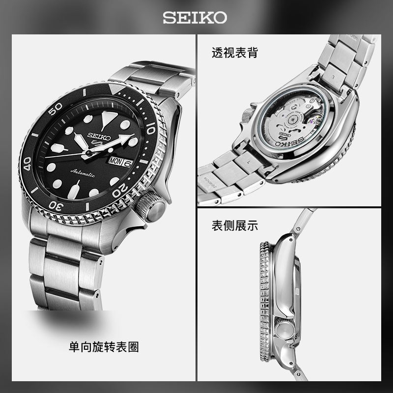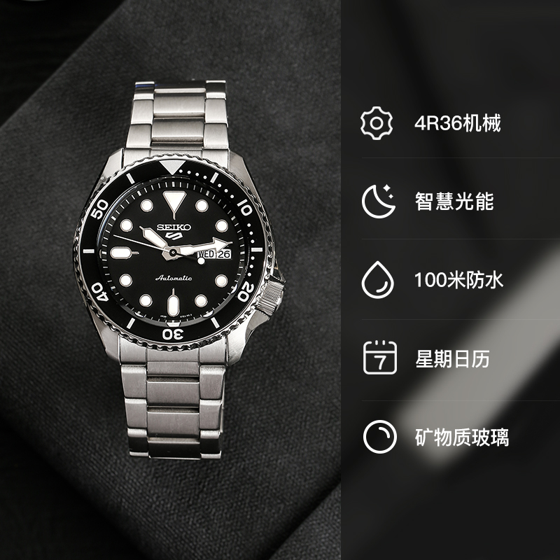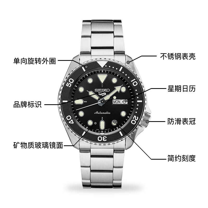这款货号为SRPD83K1 男士自动机械手表是一款潜水腕表,采用机械机芯,不锈钢表壳,直径为42.5mm,厚度为13.38mm,表镜采用矿物玻璃,单向旋转表圈,支持100米防水。夜光指示功能可以在暗黑的水下把握时间,轻松读时。