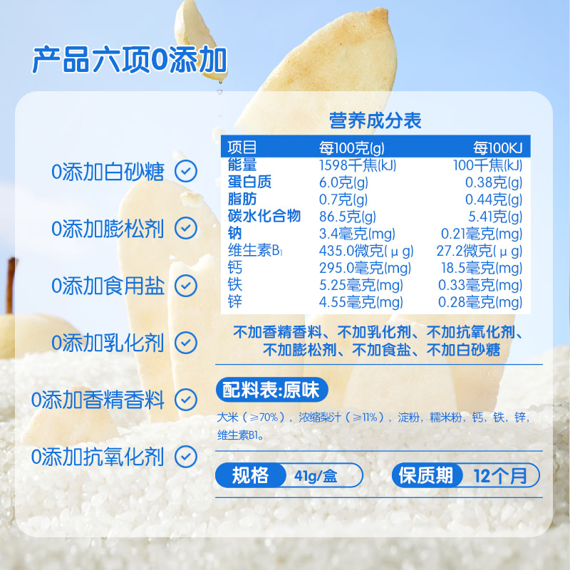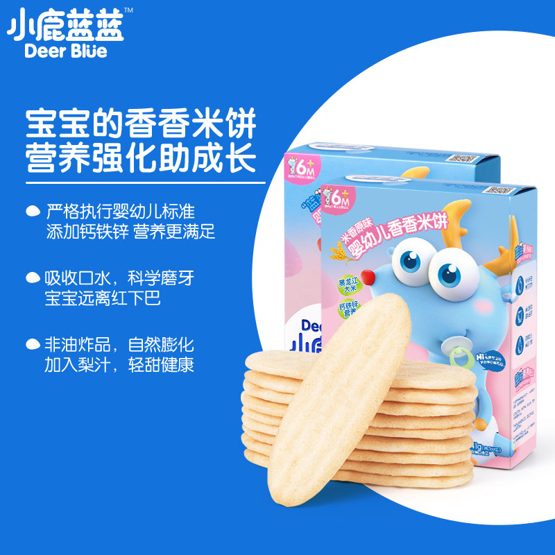 小鹿蓝蓝 婴幼儿磨牙饼干,婴幼儿标准,安全又营养,严格执行婴幼儿辅食标准GB10769,片好米饼,远离红下巴,既能温和黁牙,还能吸收口水,不添加食盐和白砂糖,不额外添加氧化剂膨松剂,强化钙铁锌,营养更均衡,成长发育不可或缺的微量元素,蓬松口感,自然清甜,添加新鲜梨汁,不增加负担