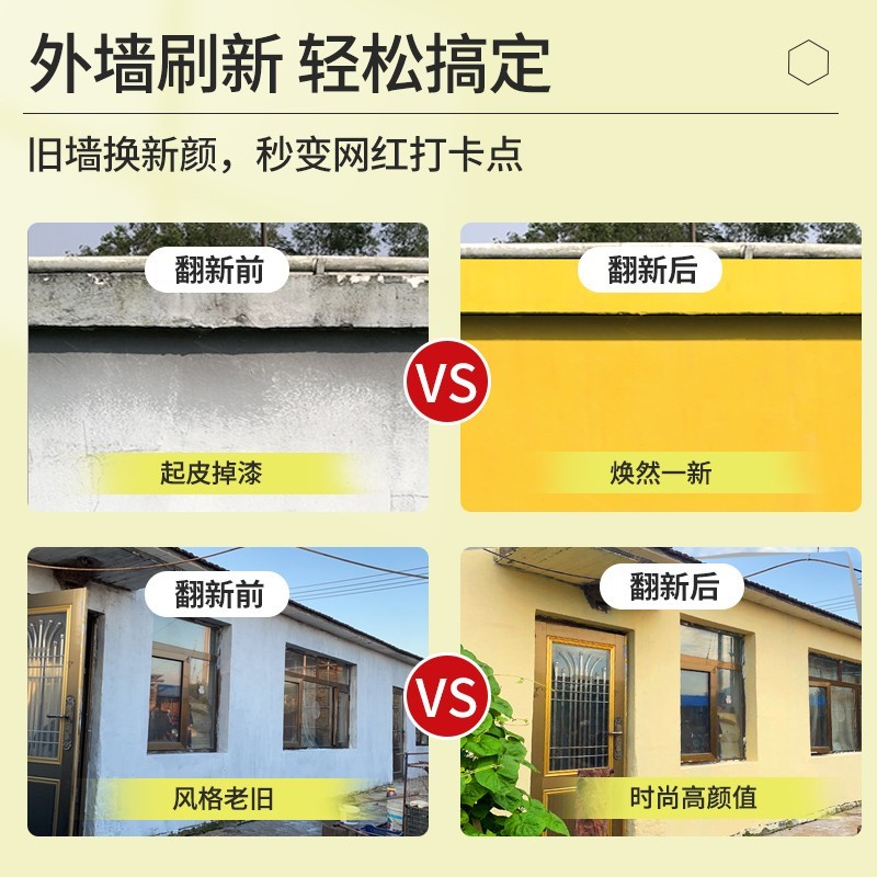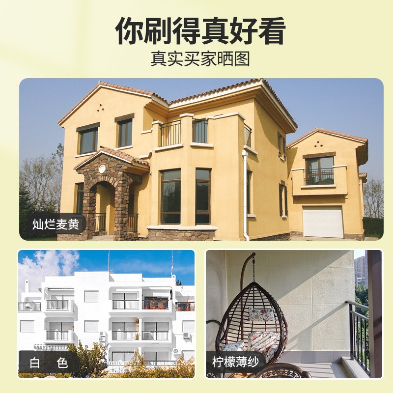 漆膜紧密,雨水冲刷即可轻松清洁。抵抗烈日,强效防晒不褪色,轻松遮盖脏污墙面,快速翻新,使用底漆,延长墙体寿命。