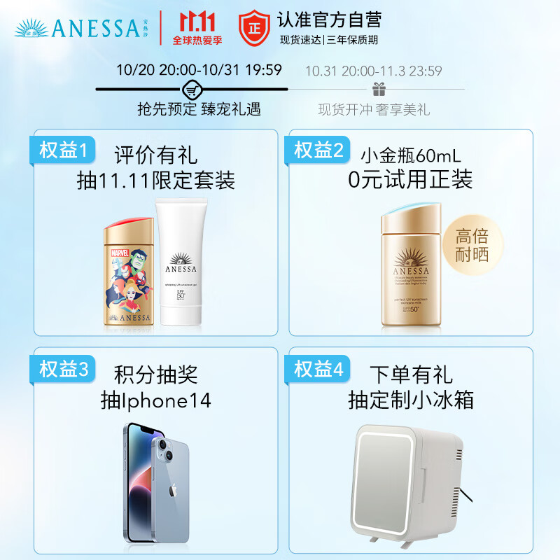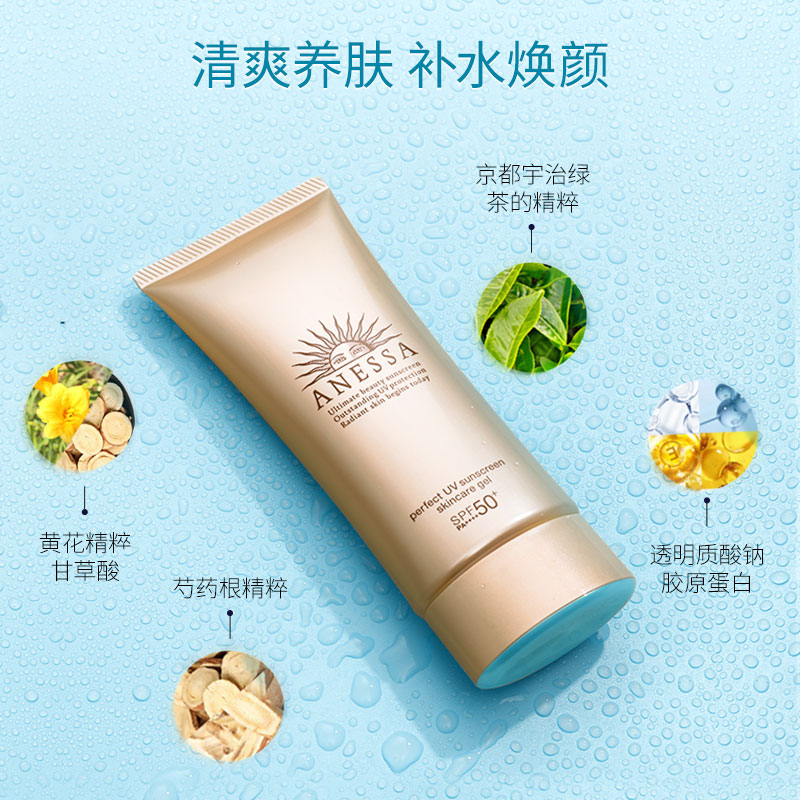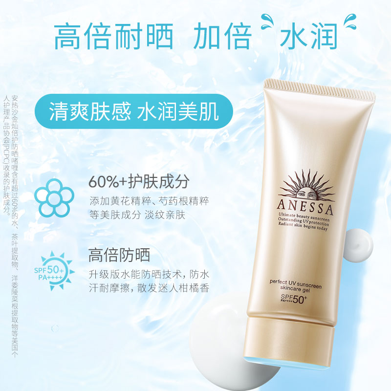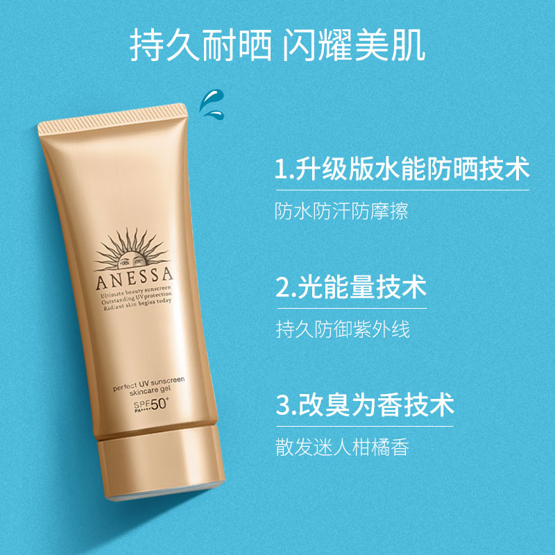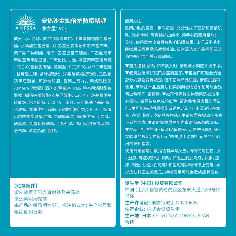 资生堂(SHISEIDO)创立于1872年,是日本著名的化妆品品牌,一直致力于对美的追求。这款金管防晒霜可以看作经典防晒小金瓶的乳液版本,采用的是物化结合的防护体系,包含了二氧化钛+OMC+水杨酸乙基己酯+Tinosorb S+Uvinul T150+Uvinul A Plus,去掉了18版中容易致敏的二苯酮-3,因此适合更多肤质使用。20版延续了50%美肌成分的配方,使用多种保湿成分和抗氧化成分抵御紫外线和高温对皮肤的伤害,同时防水等级升级为小金瓶同款的super water proof,在汗、水的浸泡下可以触发遇水更强的防护,更加适合户外活动使用,对于不喜欢小金瓶膜感的油皮来说,小金管的肤感会更出色。2020版anessa全系列在外形上和18版区别不大,最主要的识别方式就是正面的anessa的logo下方多了三行小字,可以轻松地与旧版区分开。