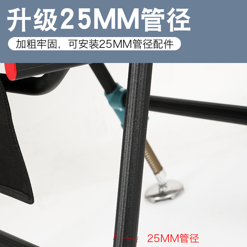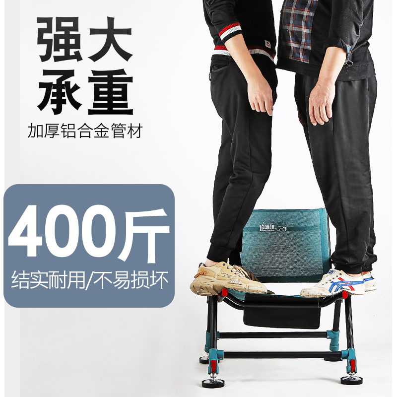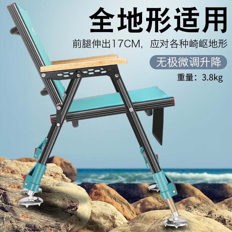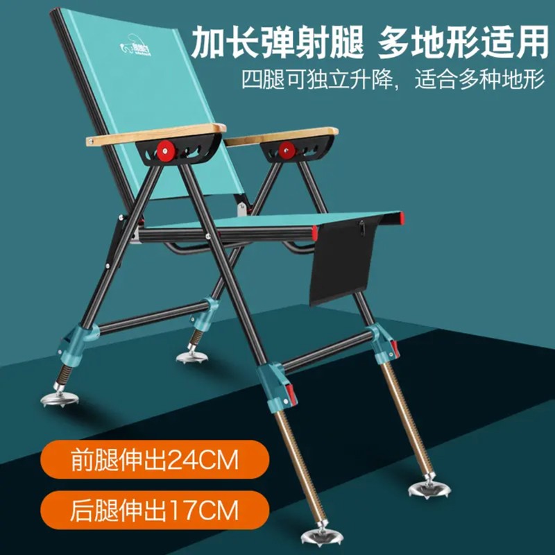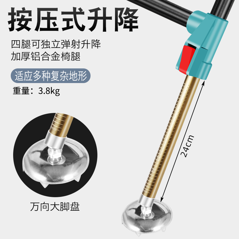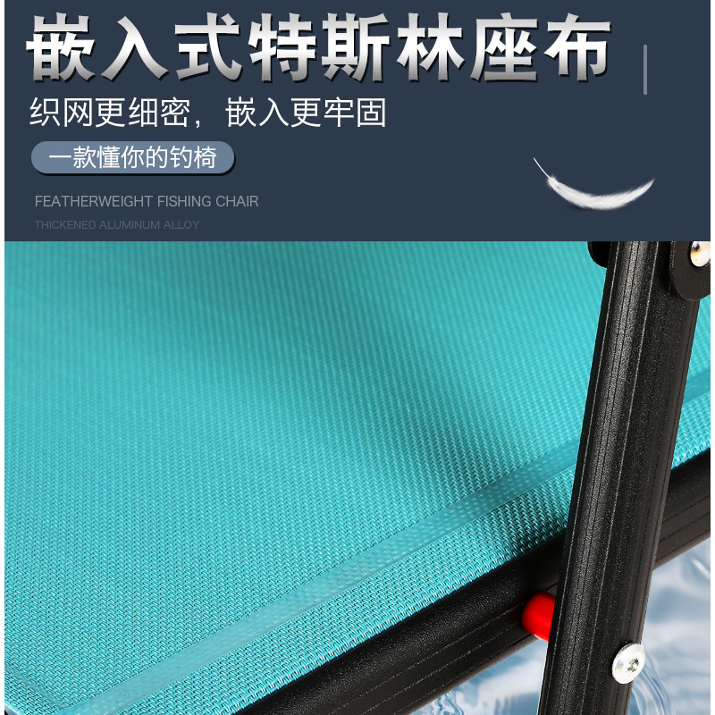 轻量化铝合金钓椅,轻松出行垂钓。全地形适用,前腿伸出24CM,应对各种崎岖地形,无极微调升降,按压式升降,四条腿独立弹射升降,加厚铝合金椅腿。嵌入式特斯林坐布,织网更细密,嵌入式更牢固。