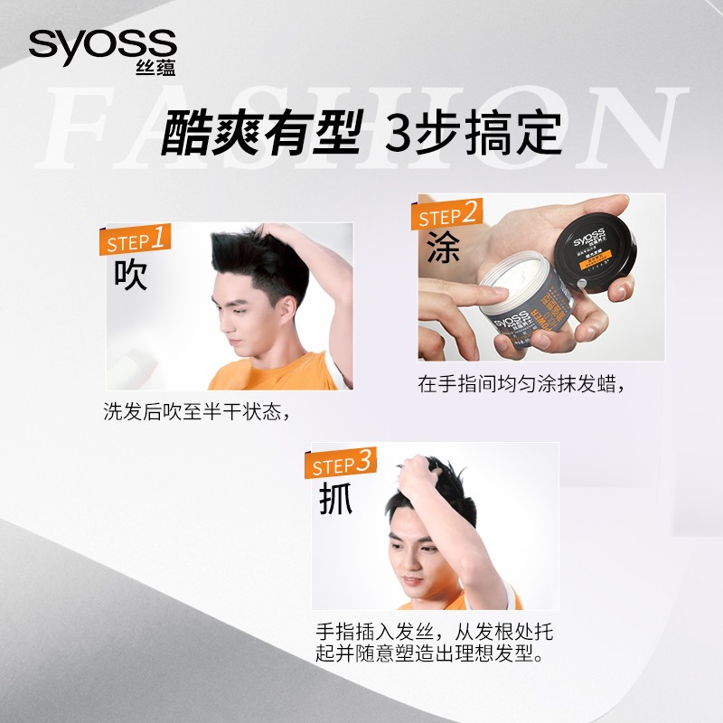 这款丝蕴(syoss)男士激强塑型哑光发蜡 是一款强力定型发蜡,定型力较强,哑光质感,清爽不粘腻。蓬松效果,动感立体不扁塌,快速干爽,易于清洗。适合短发、中短发人群。