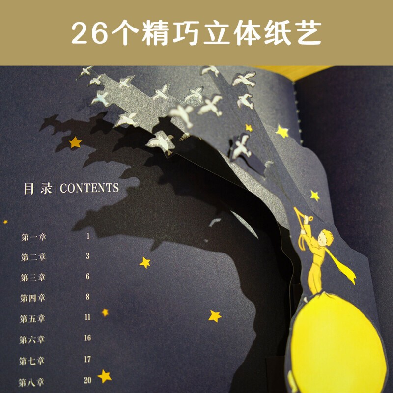 本书为《小王子》的立体书典藏版,具有极大的观赏、娱乐、收藏价值。全书共有26个精巧可动的立体纸艺装置,讲述小王子从自己星球出发前往地球的过程中,所经历的各种历险。作者以小王子的孩子式的眼光,透视出成人的空虚、盲目,愚妄和死板教条,用浅显天真的语言写出了人类的孤独寂寞、没有根基随风流浪的命运。同时,也表达出作者对金钱关系的批判,对真善美的讴歌。