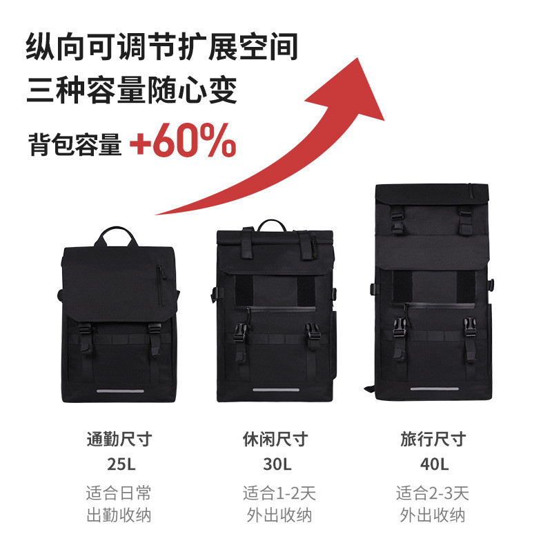 这款京东京造 8638714 男士双肩包采用聚酯纤维材质制成,纵向可调节拓展空间,25L、30L、40L三种容量随心变。内部增加电脑隔层,满足工作旅行需要。多层收纳,也易于分类存储。双侧稳定包扣设计,自由调整紧密度。有反光条、拉链压胶等设计细节。军旅风造型,酷帅有型。
