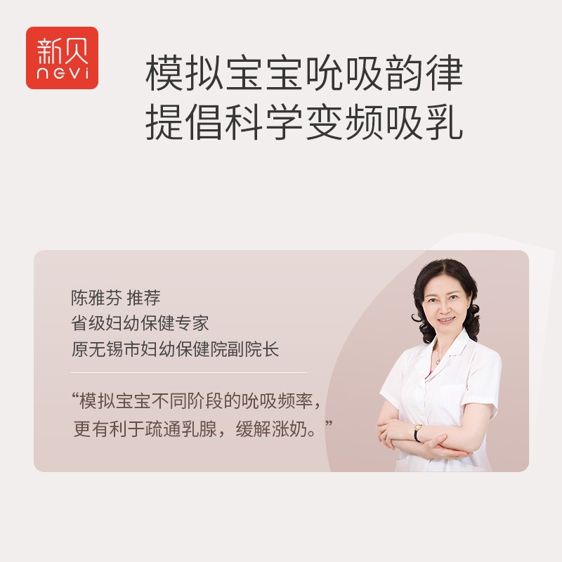 新贝为英国新贝婴儿有限公司旗下品牌,在国内知名度较高,其产品线比较丰富,主要包括婴幼儿奶瓶水杯、消毒器、暖奶器、吸乳器、调奶器、婴儿营养辅食器具等。很多产后妈妈面临着开奶困扰,如果开奶这步没做好,宝宝可能会拒绝母乳,妈妈也可能会因奶水不足产生奶涨和奶结等问题,这款新贝8775电动吸奶器主打的卖点是智能双变频技术能够深度模拟宝宝吮吸节奏,按摩疏通乳腺,帮助妈妈们在舒适状态下排出初乳。采用双韵律科技,开机后先是泌乳模式,充分按摩刺激乳腺,引发奶阵,手动转化为吸乳模式后,缓吸缓放一次吸空,帮助妈妈轻松排出高质量后奶,防止积奶和涨奶。两侧交替吸奶可以节省吸奶时间,也能避免吸一侧时另一侧溢奶,左右吸力相当,有助于排乳干净彻底。
