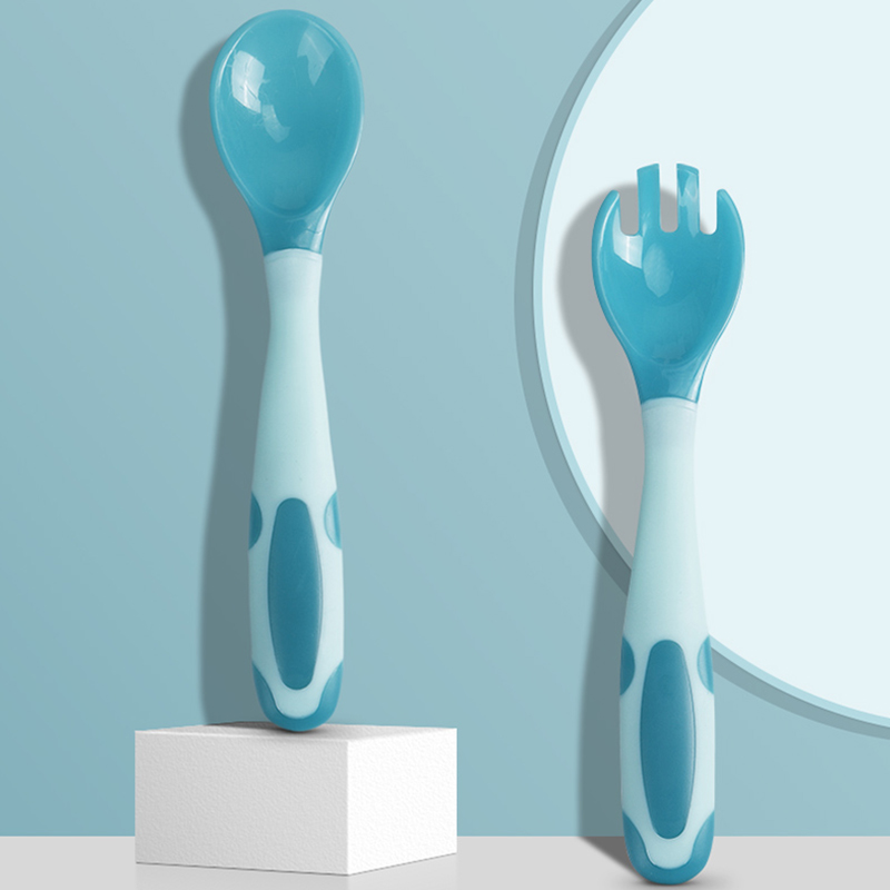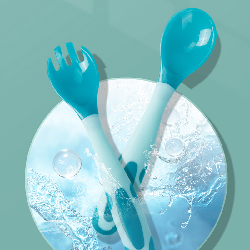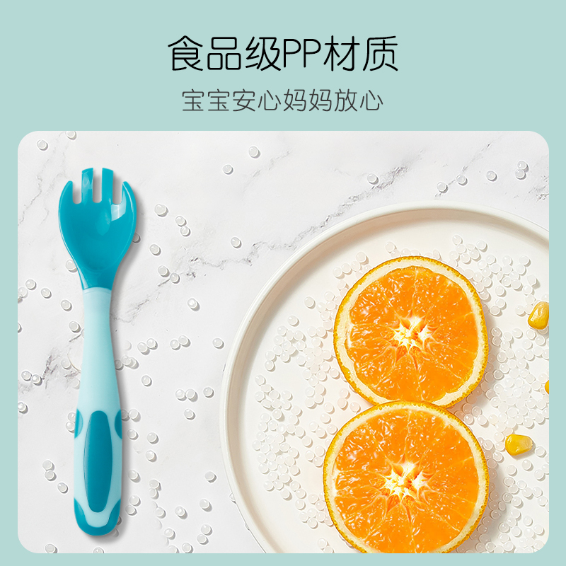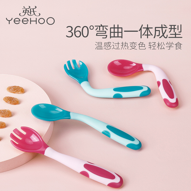 YeeHoO 英氏 婴儿温感弯头叉勺套装,勺面采用温感变色材质,常温为青色,接触的食物温度越高越变得趋近白色,刻度般把控宝宝食物温度,每一口都不会烫嘴。折不断硅胶勺柄,随意敲打不伤手。食品级pp材质,奶瓶般让人放心。