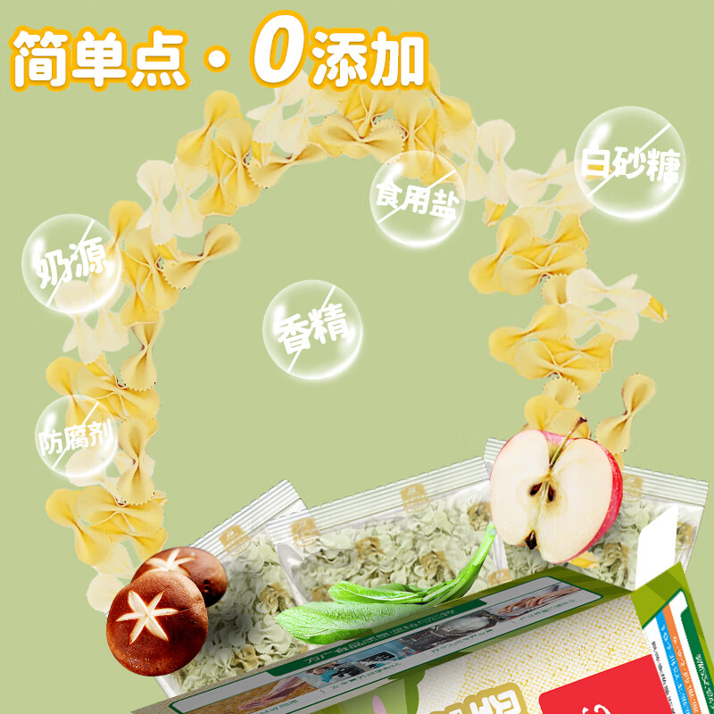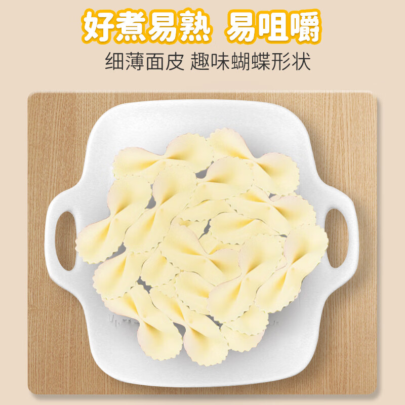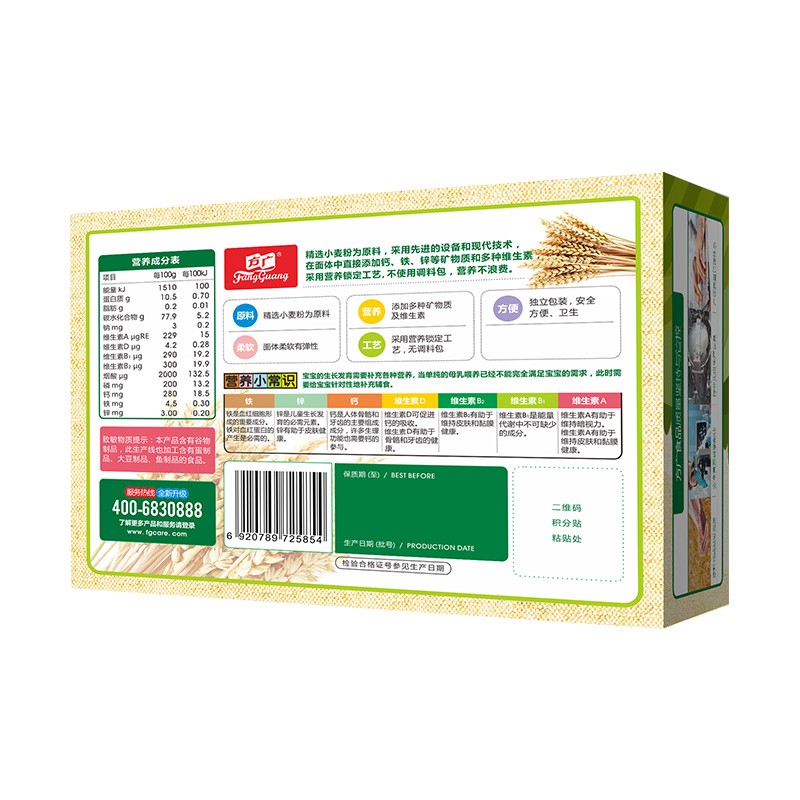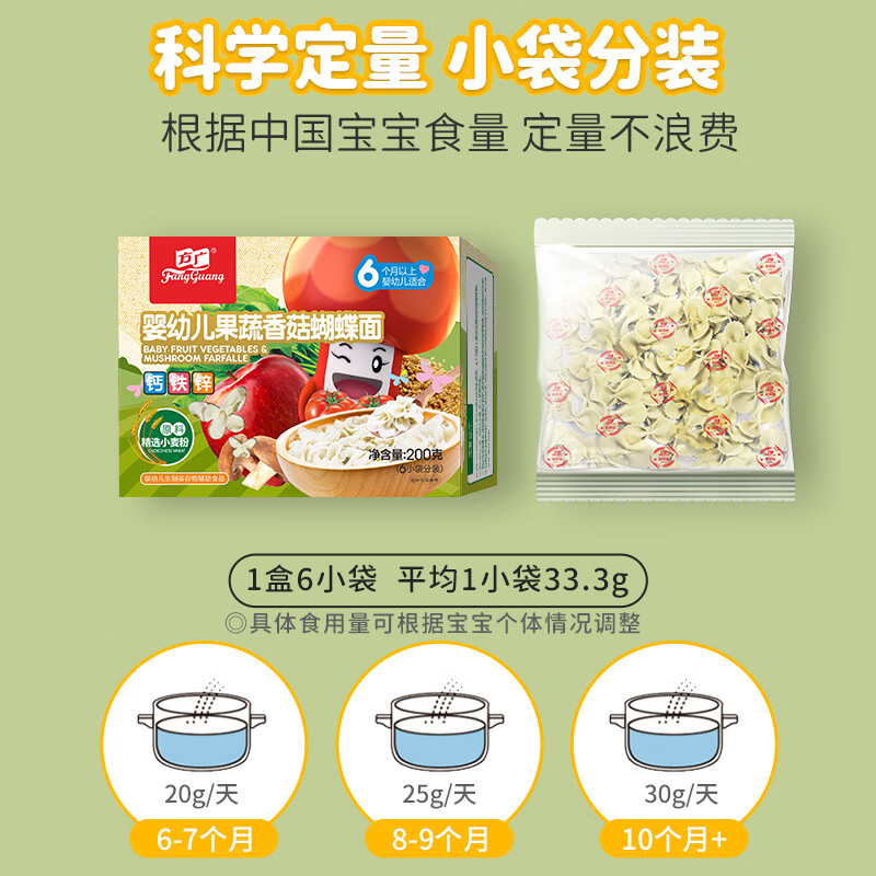 方广是婴幼儿辅食品牌,始于1995年,1999年推出国内首创专业儿童颗粒面、蝴蝶面及动物面,将先进的、科学的配方融入到我们中国的传统食品中来,为宝宝提供每天充足的营养,旗下产品包含营养面、米粉、肉酥、饼干、小馒头、果泥等。这款婴幼儿蝴蝶面选用国内优质麦芯粉,搭配蔬菜五谷,富含钙锌铁,营养均衡好吸收,无盐配方保护宝宝幼嫩胃壁,蝴蝶造型可爱特别,增添宝宝自主进食乐趣,小袋分装科学定量,方便宝爸宝妈精准喂养。