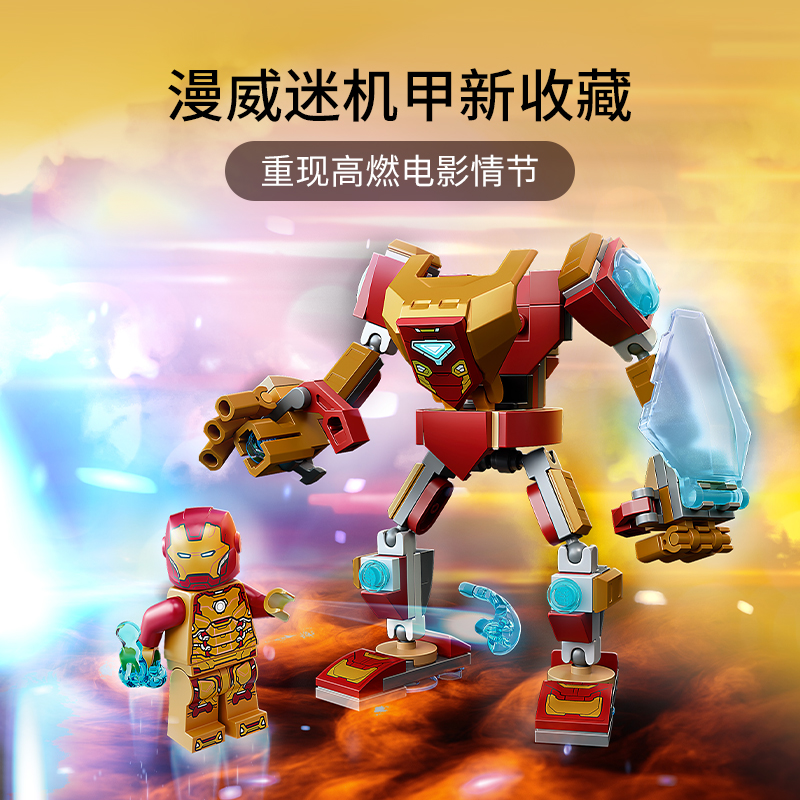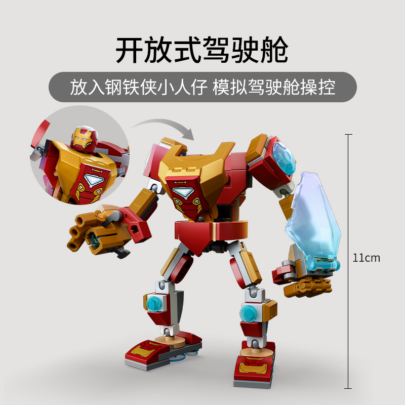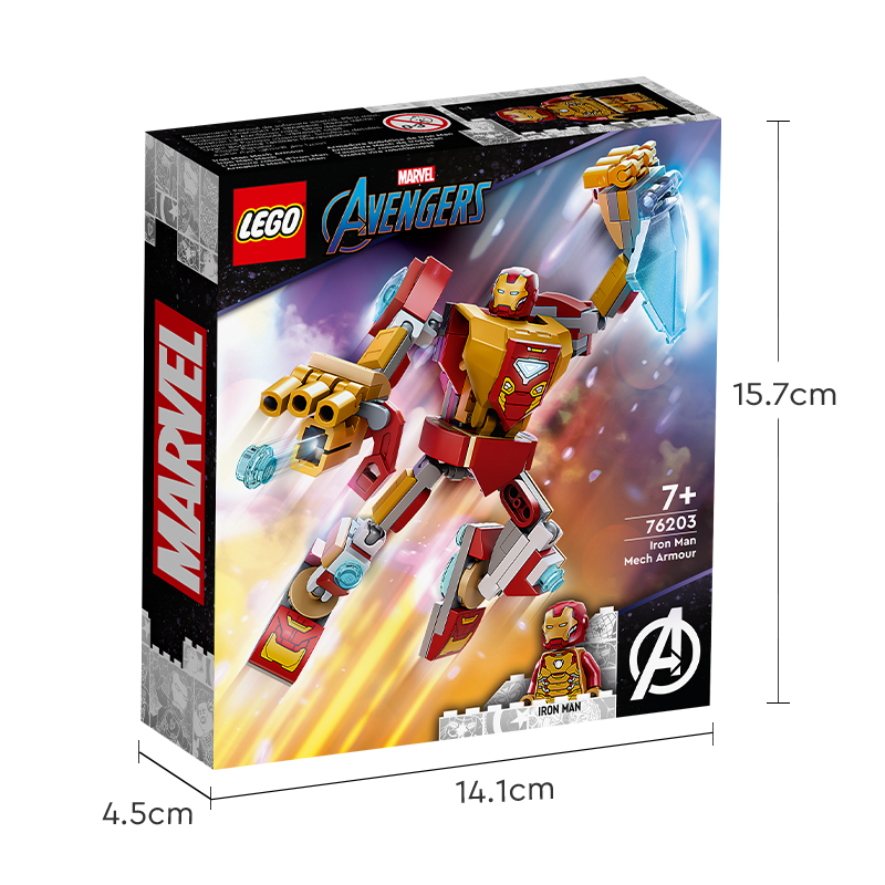钢铁侠机甲(76203)属于漫威系列积木套组,首发于2022年,整个套组包含 130 个积木颗粒。那这款强大的机甲会令钢铁侠游戏更加恢宏精彩。孩子们可以把钢铁侠小人仔放到巨型钢铁侠机甲可以打开的驾驶舱中。借助这款机甲的凸粒发射器、大型能量护盾及完全铰接式手臂和腿部,孩子们可以重现他们喜爱的场景,与其它机甲进行大战,以及表演属于他们自己的超级英雄大冒险。当行动任务告一段落时,孩子们喜欢把钢铁侠机甲展示在他们的房间里,直到开启下一次冒险。
