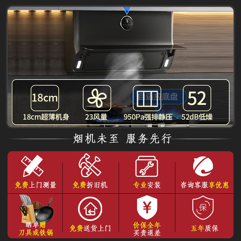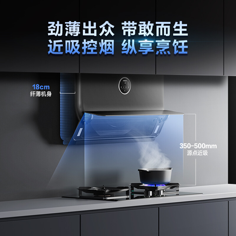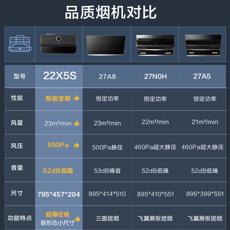 22X5S新品重磅上市,【超薄】18cm超薄机身,百搭墨参灰,不仅适配多样橱柜,而且多释放57%的上柜空间,高效储物 【超强】小机身大本领:智能变频、23m3/min风量、950Pa大风压,油烟无处遁形; 【超净】安装新低度:离油烟源头更近,油烟瞬吸不过脸;5.2kW大火力,快速锁鲜,迅速断生;68%热效率一级能效,更高效率,更省燃气; 【超便捷】8档位调节,控制更精准;