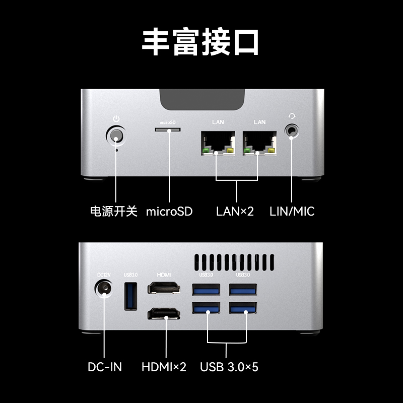 配置方面,处理器采用 J4125 处理器,四核心四线程,动态加速频率 2.7GHz,支持双4K高清显示输出。搭配 LPDDR4 8GB 内存。搭载 intel UHD 600 超核心显卡,支持 4K@60Hz 高清显示输出,可以同时连接两个高清显示设备。