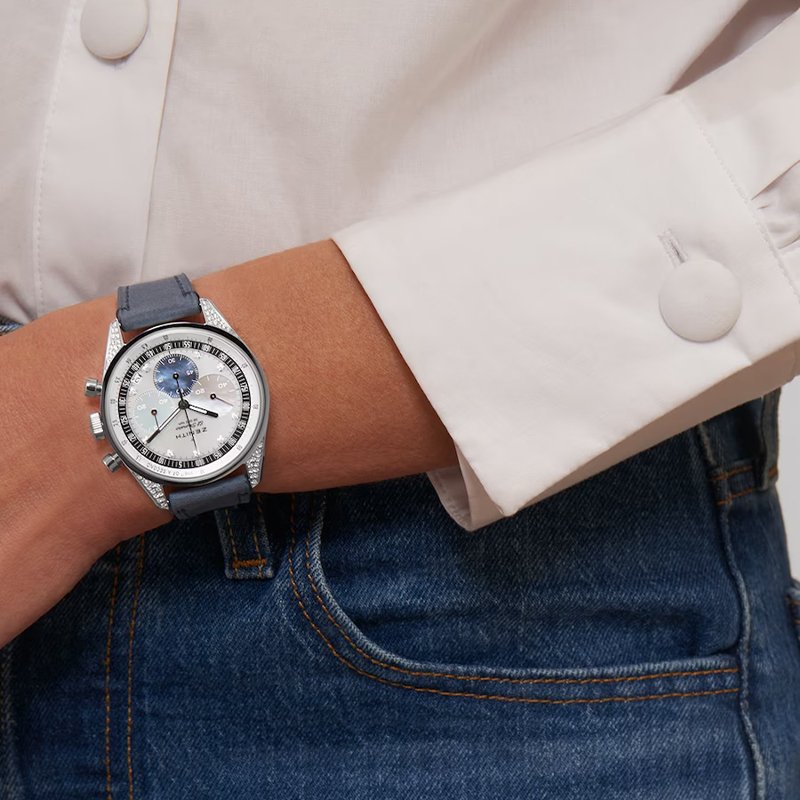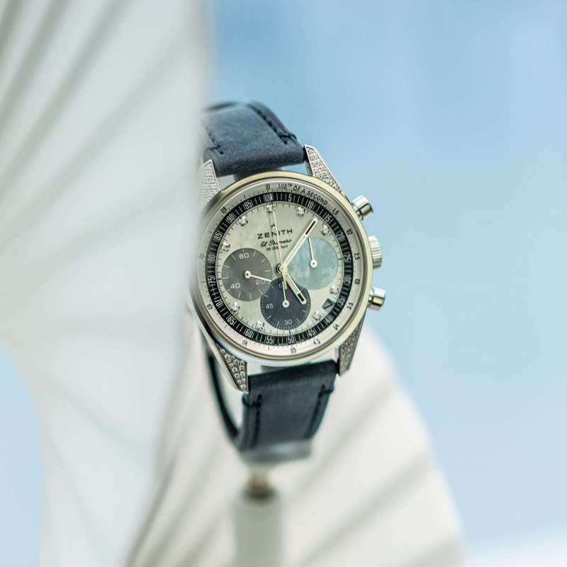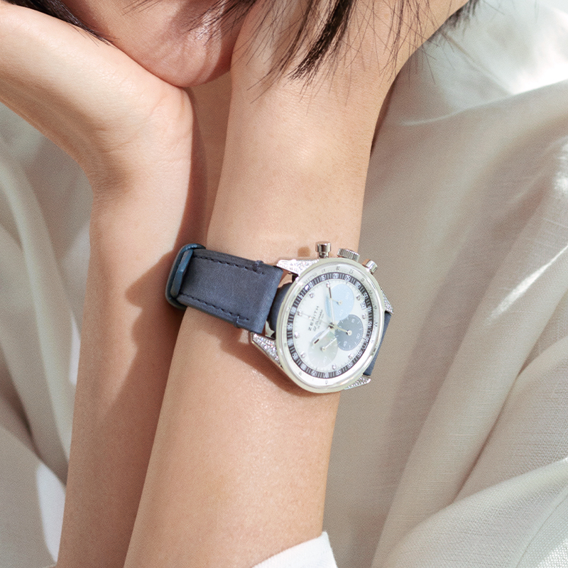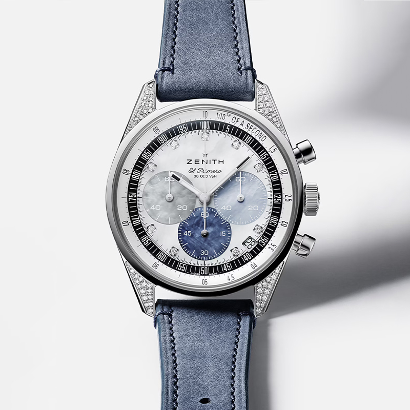 此款产品为ZENITH 真力时 旗舰系列 女士机械表 16.3200.3600/02.C907,优雅演绎经典三色设计,以璀璨钻石和多色珍珠母贝表盘,重新诠释CHRONOMASTER Original 1/10秒计时码表的魅力。腕表以妙趣时尚的方式演绎经典三色表盘,令人一见难忘。无论是寻找华美计时码表的女士,还是沉醉于腕表炫目迷人魅力的男士,皆为之倾倒。