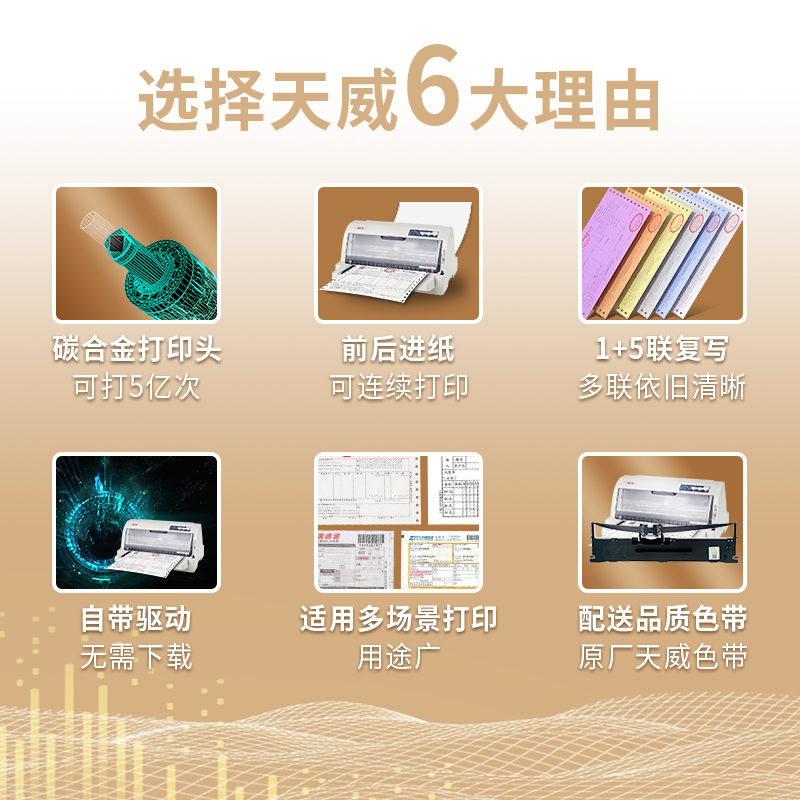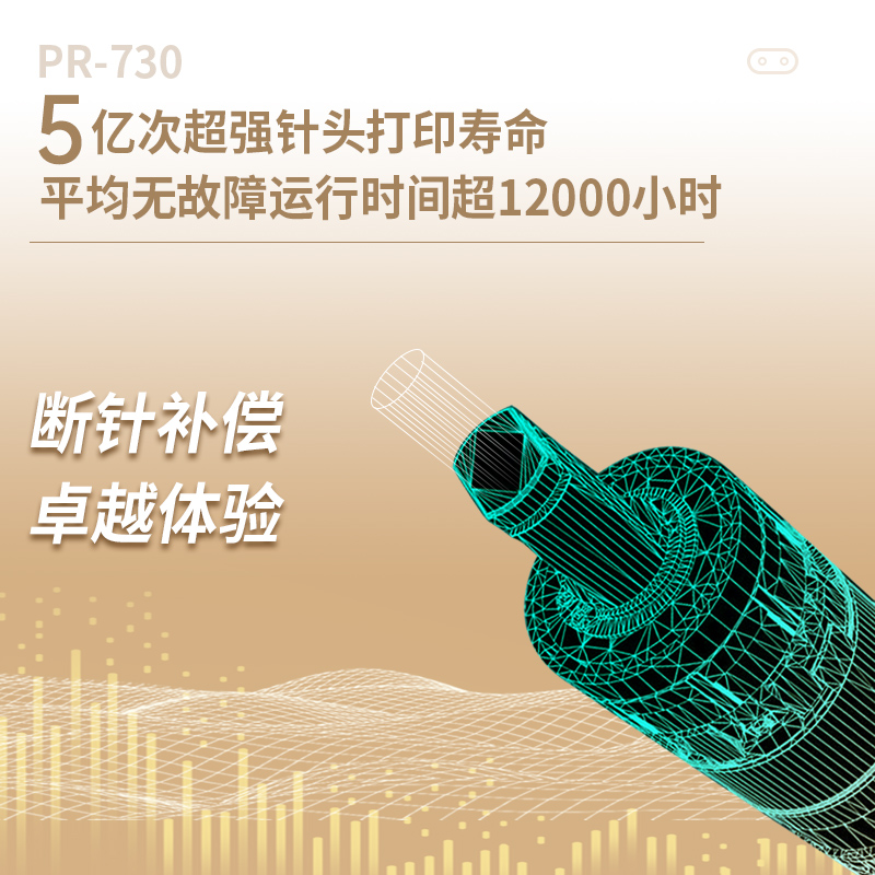 天威 PR-730K采用碳合金打印头,精致的打印头稳定耐用,寿命达到5亿次每针。配送8M长色带,天威原厂制造,支持400万字符打印。
