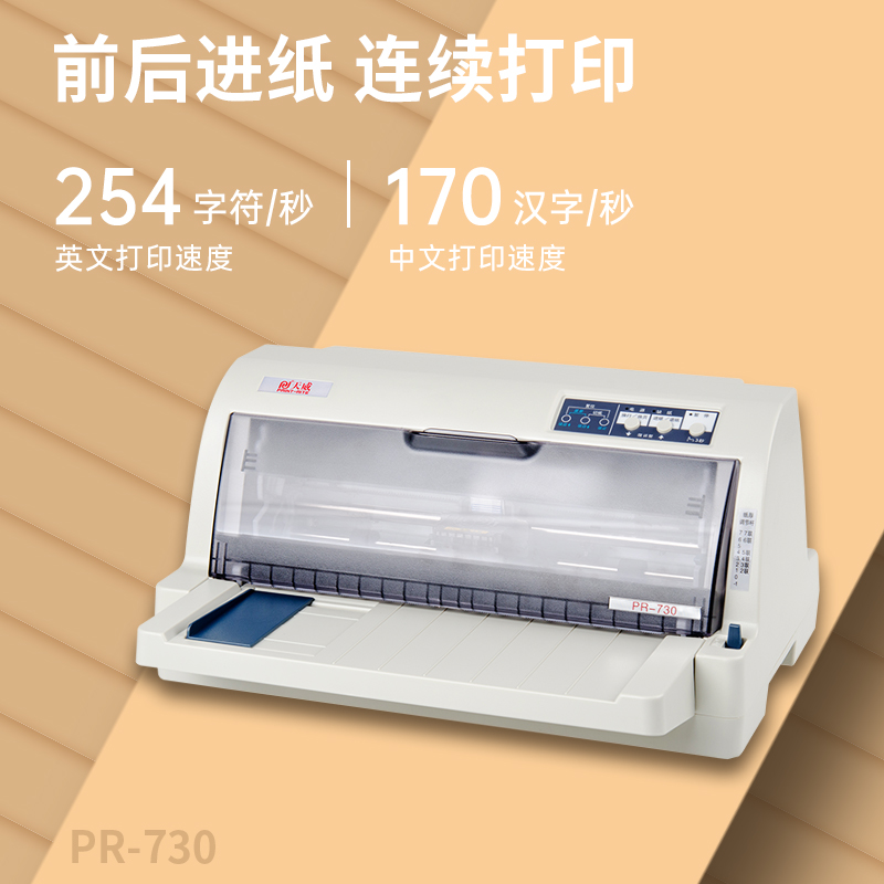 天威 PR-730K针式打印机多种介质轻松打印,可自动适配介质厚度,适用多种证件。高效快速打印,双向短距离逻辑定位打印,省时高效,便捷前后进纸设计,让操作更随心。1+5联强复写,精密高清打印,每一页都清晰可见。24针打印头,二维码轻松识别,82列平推设计,适用A4纸尺寸。
