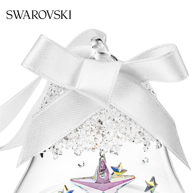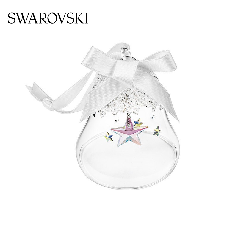 SWAROVSKI 施华洛世奇 CLASSIC ORNAMENTS 星耀铃铛挂饰 5545500,以圣诞挂钟为特色,缀有浪漫星星,缔造梦幻冬日氛围。圣诞钟造型内,有一枚带有数百个切割面的仿水晶星星,搭配白色缎带。
