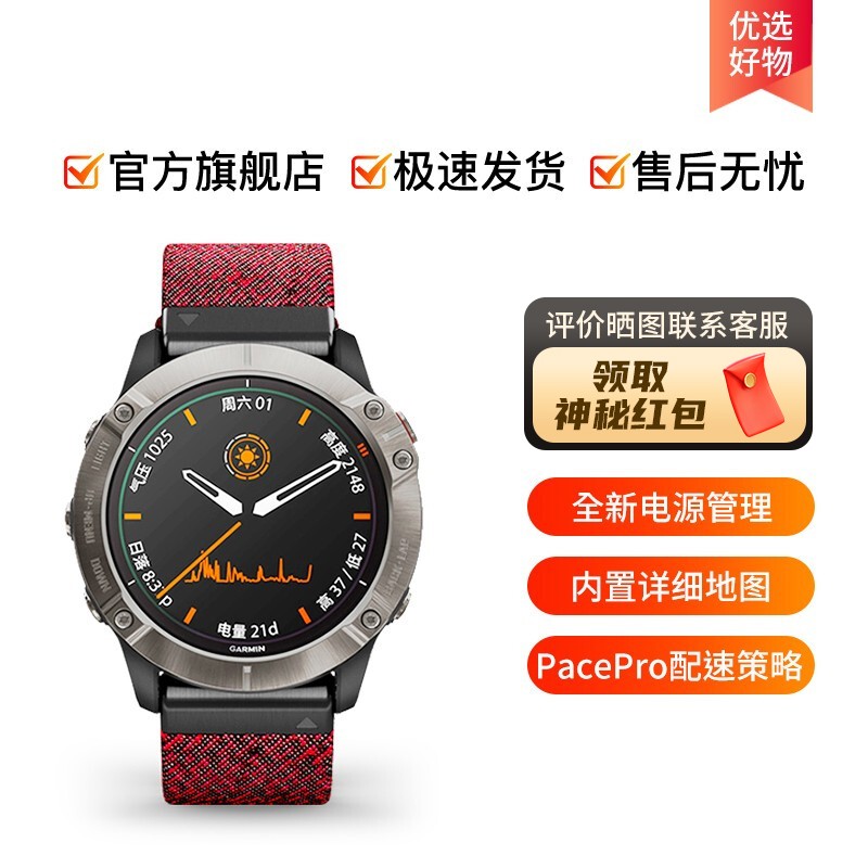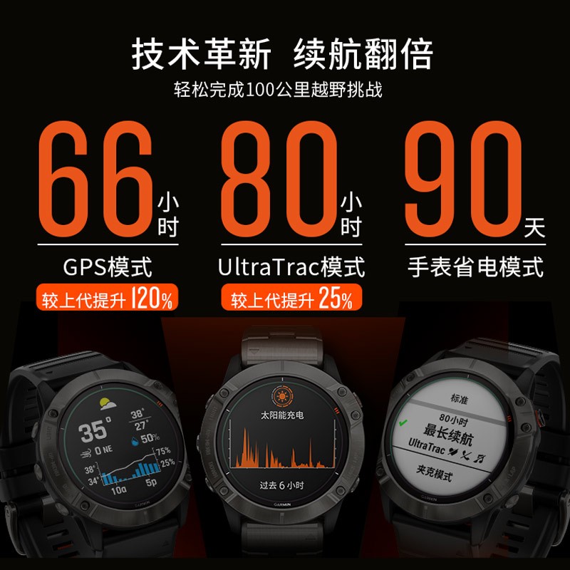 Garmin 佳明 fenix 6x pro GPS 多功能智能手表 ,GPS模式续航66小时较上代提升120%,手表省电模式续航90天。支持血氧饱和度、最大摄氧量、全天压力分数、身体电量、睡眠监测、腕式光学心率、紧急联系人、生理周期等,内置多种运动模式。