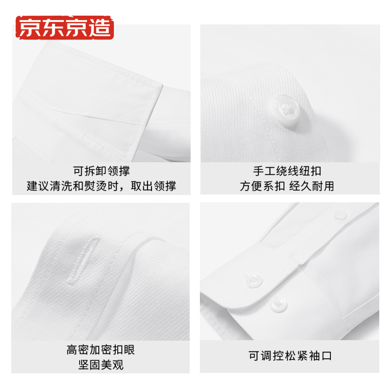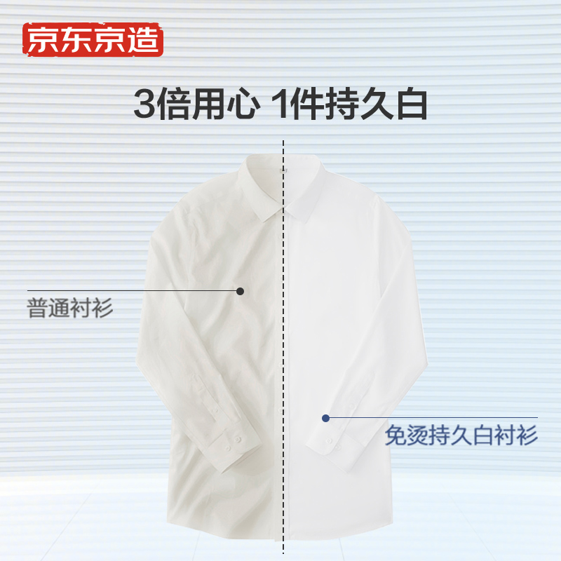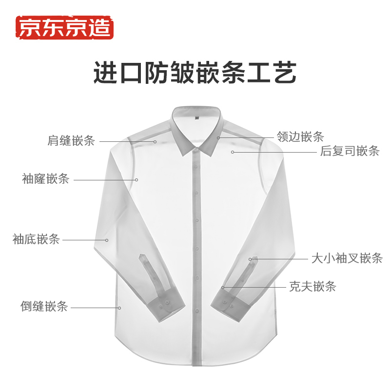200支新疆长绒棉,柔软舒适,自然透气,DP3.5级成衣免烫,37℃体温熨平技术,AAA级抗菌,远离异味,环保安全。一件持久白,多次水洗、洁白如新,奢侈品级辅料,绕扣工艺,英国高士纱线,源自每天日晒超过18小时的新疆长绒棉,更亲肤。高奢超细200支精梳纱线4股并捻,织就品质面料,更高端 AAA级抗菌,防螨抗菌,防止异味,更健康,京造立体裁剪,结合人体工效学,更包容。