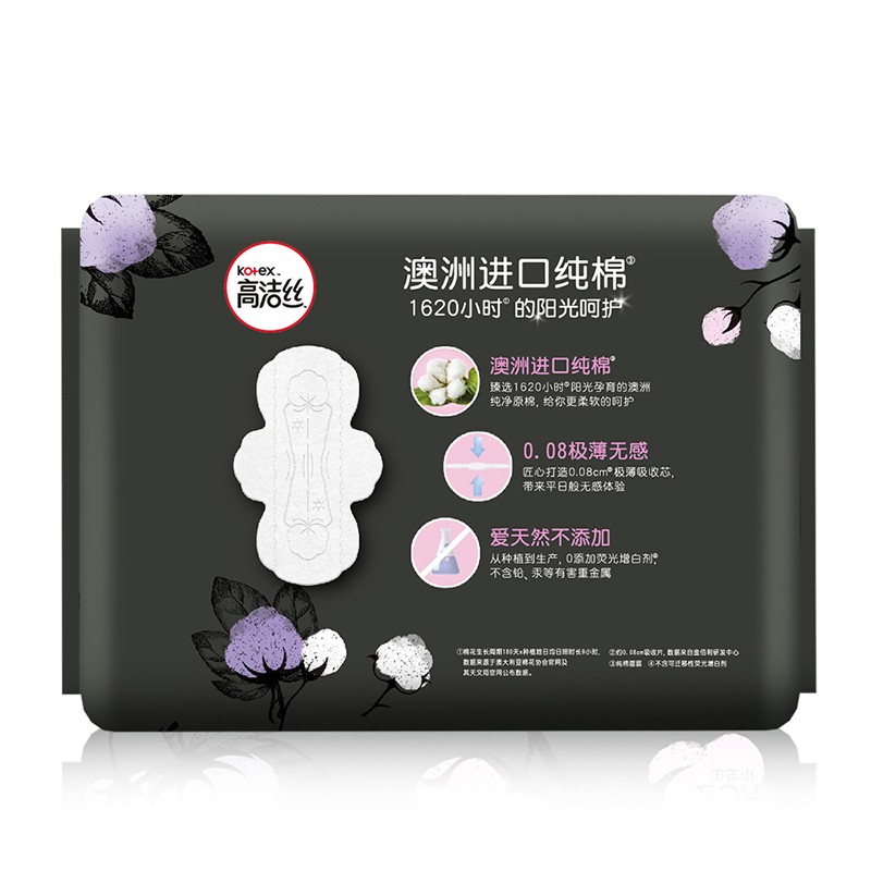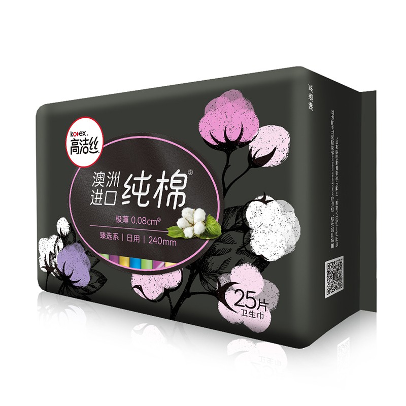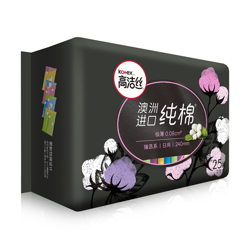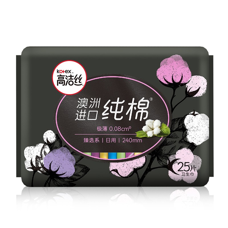 Kotex 高洁丝是Kimberly-Clark金佰利集团旗下的女性卫生用品品牌,产品包括纯棉卫生巾、超薄卫生巾、日用卫生巾、夜用卫生巾、迷你卫生巾、夜安裤、护垫等女性卫生巾产品。这款臻选系列卫生巾,采用澳洲进口棉花,0.08mm的吸收芯,吸收快无不适感,不含可迁移性荧光增白剂,不含重金属,使用更安心。包含240mm的日用装25片每包。