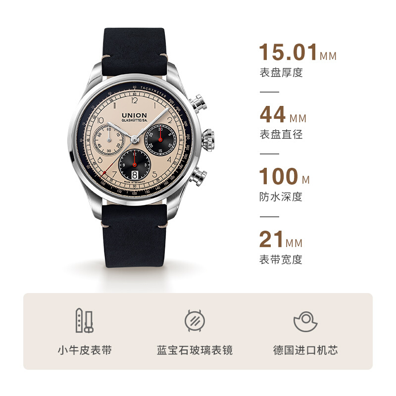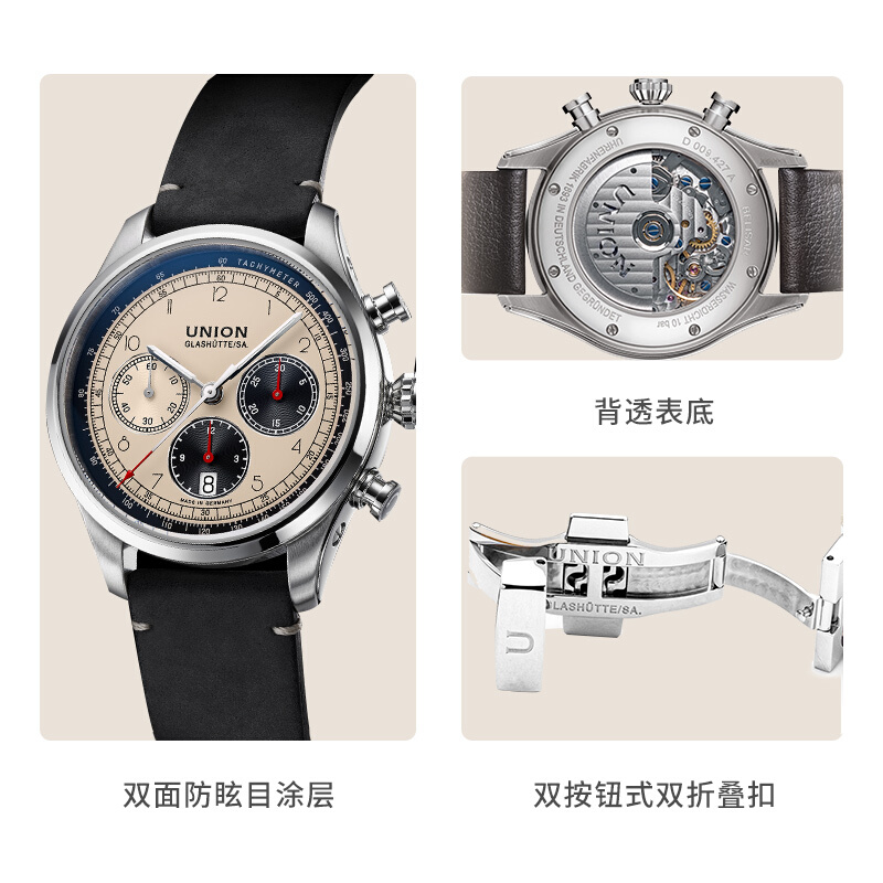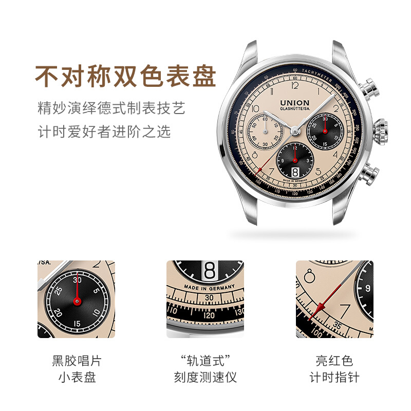 这款UNION GLASHÜTTE 格拉苏蒂宇联 贝利士系列 男士自动机械表 D009.427.16.262.00,不规则撞色设计,精致做工,特殊数字时标字体,独特不对称熊猫设计,黑胶唱片纹设计,个性鲜明,小牛皮表带,时尚百搭。选用UNG-27.01自动上链机芯,动力存储60小时,蓝宝石玻璃表镜,抗刮耐腐蚀,背透表底,奢华大气。