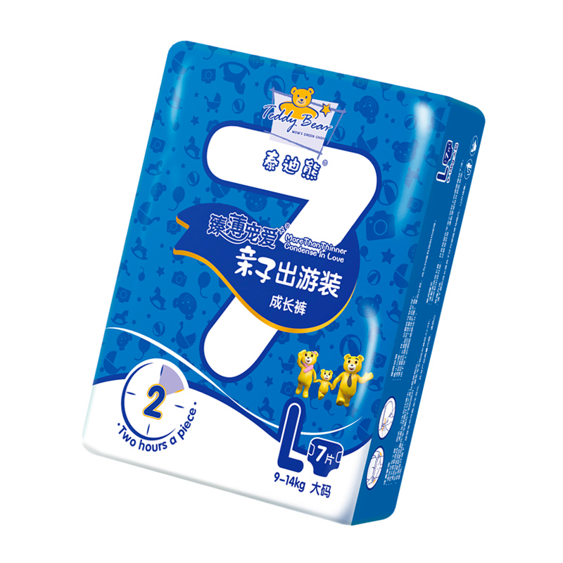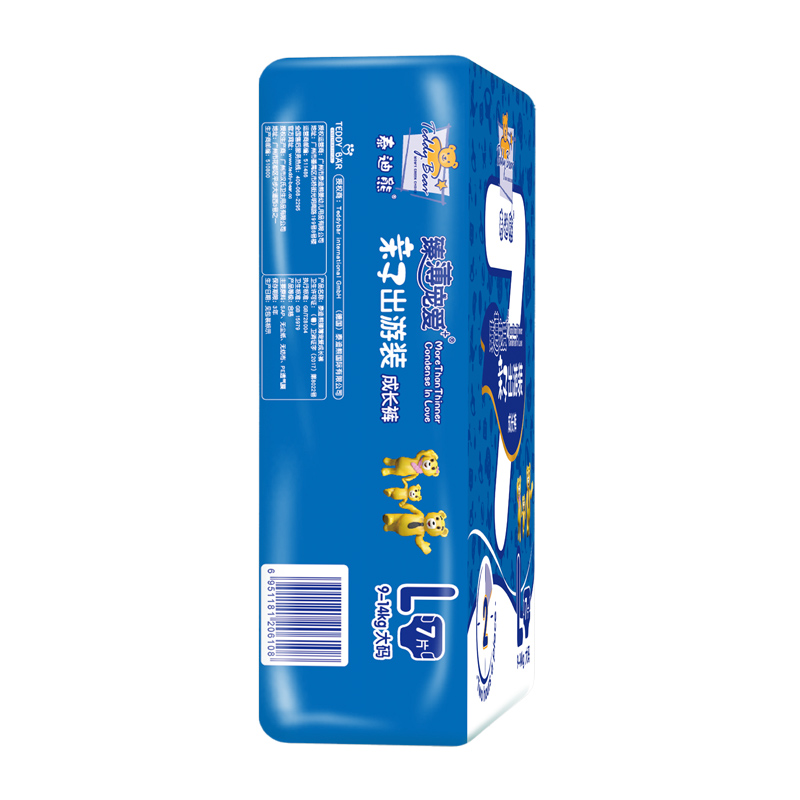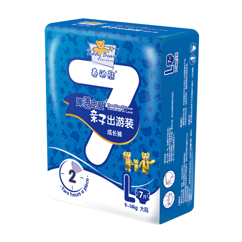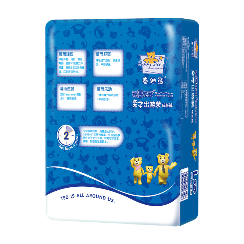泰迪熊纸尿裤品牌由德国著名的婴童消费品公司Teddybär international GmbH授权,2009年开始进入中国市场,旗下有呼吸特薄系列、臻薄宠爱系列、亲肤肌贵系列等系列纸尿裤。泰迪熊甄选全球知名材料供应商,确保所有产品的原材料安全,如:德国巴斯夫、德国汉高、美国3M材质供应商,都是泰迪熊的原材料合作伙伴。本款臻薄宠爱系列拉拉裤薄约2mm,数万个微透气孔,透气不闷热。日本住友进口高分子,多边形快速吸收,防止渗漏。进口橡胶弹力腰围,舒适不勒腰,一拉即穿,穿脱非常方便,让宝宝随心而动,自由探索周边世界。