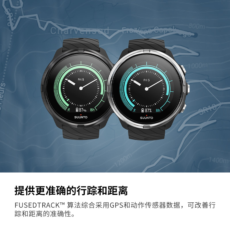 颂拓(SUUNTO)芬兰进口Suunto 9系列精英版不锈钢表盘,蒸汽,水等弱腐蚀性介质,不生锈且更轻盈,挑战户外严苛环境,为您的探险之旅提供保障。镜面耐磨,耐腐蚀,透光性好精细仿钻石面切割工艺加工清澈透光,高能抗刮,坚固耐用。户外功能GPS跟踪和导航高度计、气压计、指南针日出、日落时间。