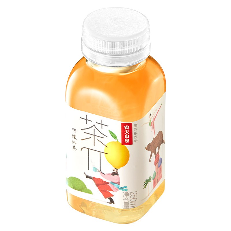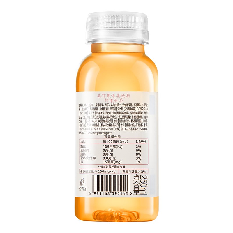 农夫山泉即农夫山泉股份有限公司原名“浙江千岛湖养生堂饮用水有限公司“,其公司总部位于浙江省杭州市,系养生堂旗下控股公司,成立于1996年9月26日。其传统产品主要为瓶装矿泉水,取自千岛湖的深层水;2003年又推出以“农夫果园”为品牌的混合果汁饮料;其它产品还有“尖叫”、“农夫茶”、“农夫汽水”、“水溶C100”等饮料。农夫山泉这款茶饮料。融合果香和茶香,茶中商品,即饮好选。规格:250ml*12瓶。