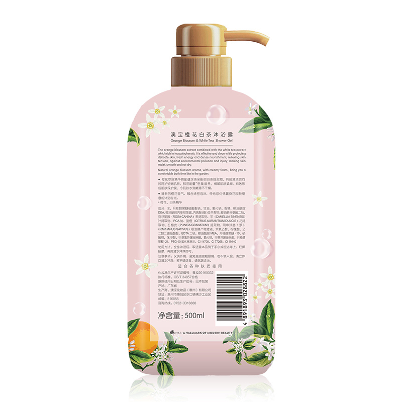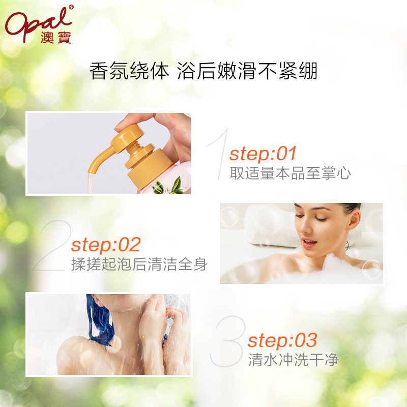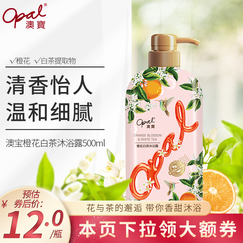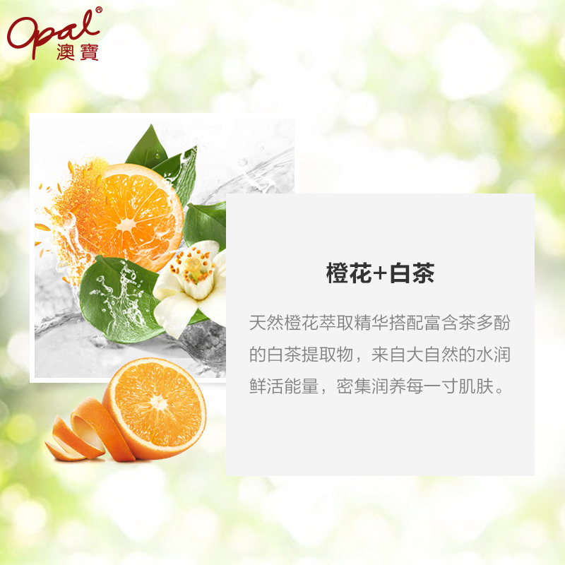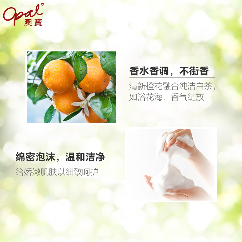 opal 澳宝 橙花白茶香水沐浴露,添加百合提取物,结合冰泉水成分,深层洁净,水润不黏腻。IFF国际调香师设计,前调为绿叶、柑橘、葡萄柚、空气清香,中调为栀子花、玫瑰、铃兰、茉莉;后调为麝香、木香、香草。规格:500ml