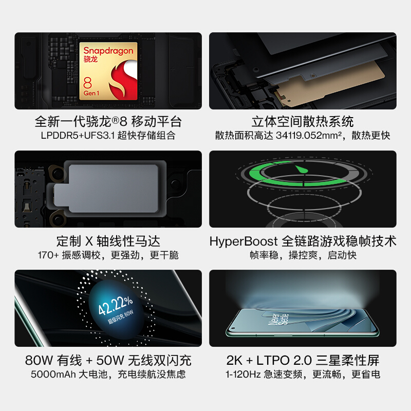 全新的⼀加 10 Pro 定位性能旗舰,在性能、设计、影像、屏幕等⽅⾯带给⽤户全⾯的旗舰享受。外观设计上,采用了金属边框,与钟表级 3D 精密陶瓷镜头盖板自然衔接。背板采用第三代丝绸玻璃工艺,不易沾指纹,屏幕圆角与边框完美匹配,整体性更强。屏幕⽅⾯,采⽤三星 E4 材质曲面屏,2K分辨率加LTPO 2.0,支持1-120Hz自由刷新、1Hz AOD息屏显示。 性能⽅⾯,⼀加 10 Pro 搭载全新骁龙8 Gen 1 旗舰级处理器 + LPDDR5 + UFS3.1 旗舰性能铁三⻆,辅以全新的空间散热系统,散热面积高达约A4纸面积 55%,一加最大面积的散热系统,助⼒满⾎输出表现。还全新采用 HyperBoost 全链路游戏稳帧技术,图形异构 芯片级游戏技术,在保持高性能的同时还能保持低功耗,GPA 极限稳帧技术,更高、更稳、更持久,O-Sync 超频响应,重新定义跟手性。首发定制 X 轴线性马达,体积增大14%、振动量提升47%、灵敏度提升100%、响应时间提升50%。重量在保持200.5g的同时,还塞入了 5000mAh ⼤容量电池,80W 超级闪充,32分钟即可充满100%,50W 无线闪充,还支持无线反向充电。同时,⼀加 10 Pro 还⾸批搭载 ColorOS 12.1,系统体验更流畅。 影像系统⽅⾯,⼀加 10 Pro 搭载4800万像素主摄+5000万像素超⼴⻆以及800万长焦镜头⽅案。主摄采⽤旗舰级 IMX789 传感器,支持 4K 与 8K 高清录像,采用最高支持150°超广角镜头,同时搭载哈苏影响2.0系统,带来超过500种色彩优化,且支持哈苏专业、Log 模式、DOL-HDR、新增10亿色功能,让影像更具可玩性。