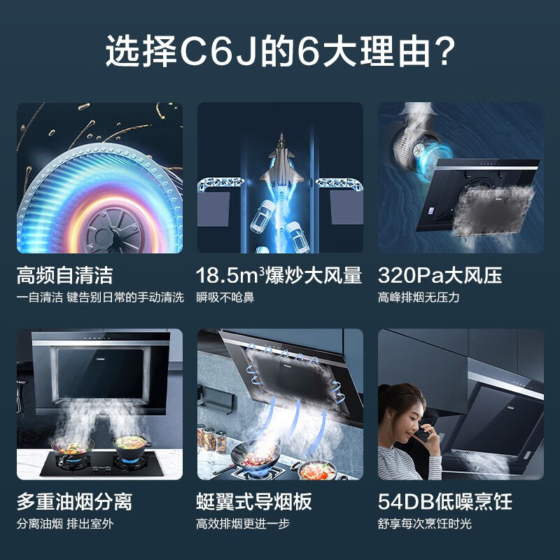 这款海尔 E800C6J型号侧吸油烟机,风量排风量15 m3/min,风压大于230Pa,油脂分离率86%,120摄氏度高温自净芯,第三代不沾油防污网。