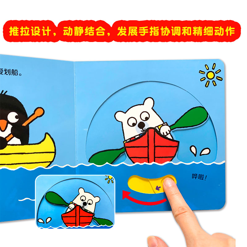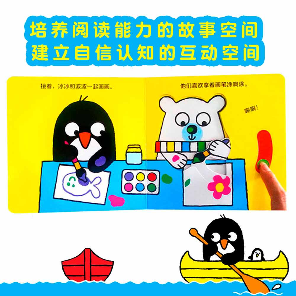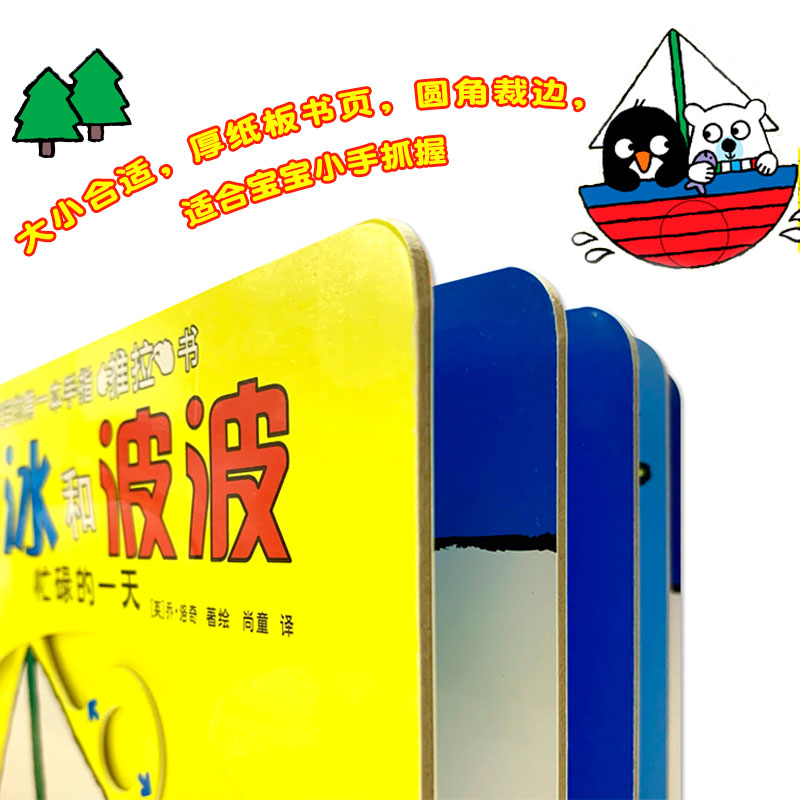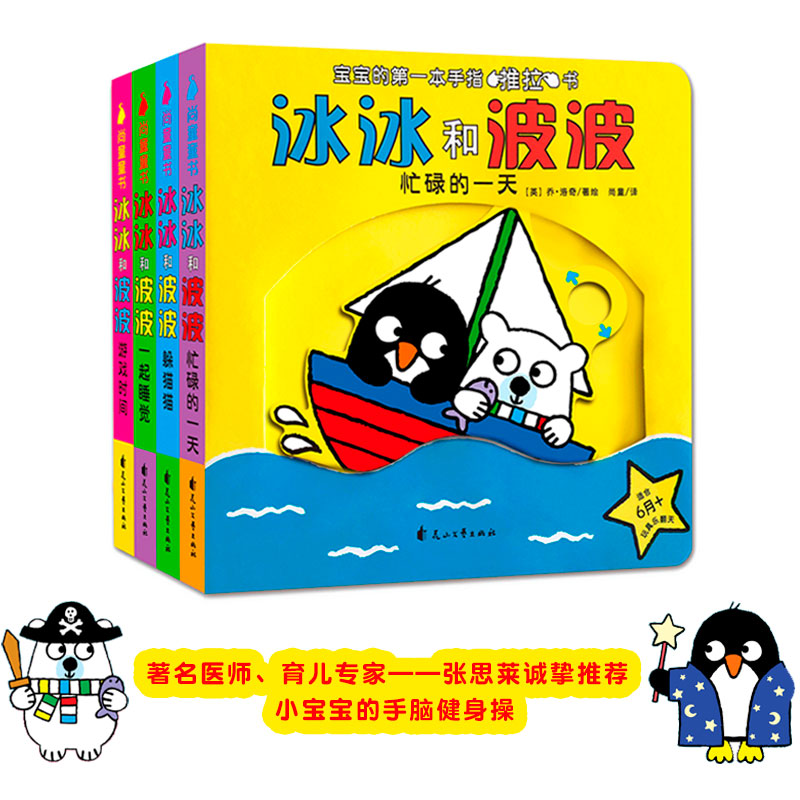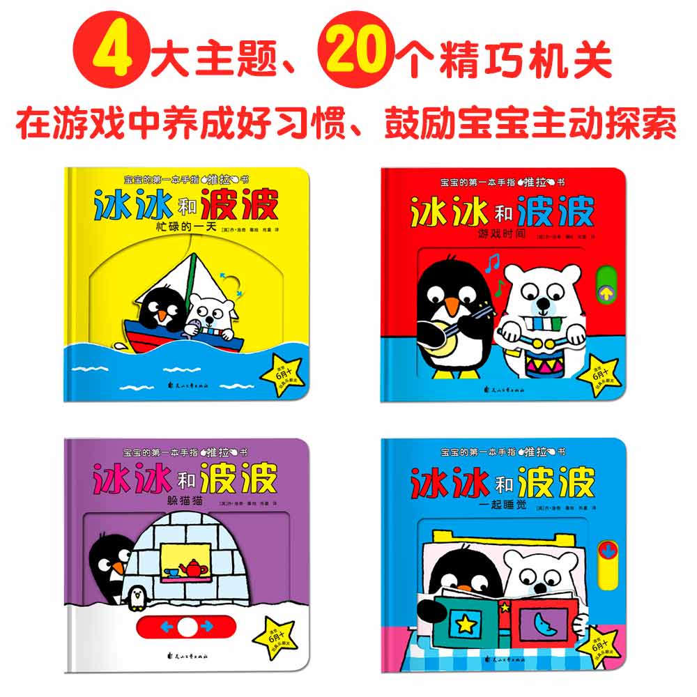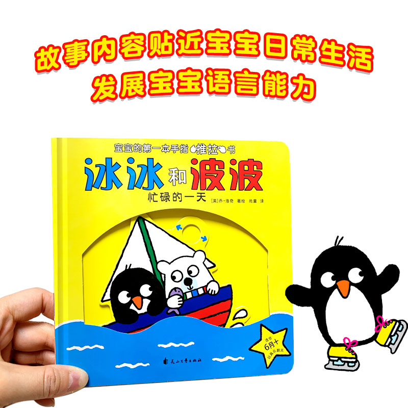 一套适合0-2岁孩子的推拉玩具书,推一推、拉一拉就会移动的简单操作,适合婴幼儿的小小手。冰冰是一只可爱的小企鹅,波波是一只憨憨的北极熊。他们俩是一对儿好朋友,共同生活在寒冷的北极。这是一个新颖的互动天地,小朋友随着每一页的翻动,滑动的那些机关,就可以跟随着小企鹅和小北极熊一起,刷牙、捉迷藏、溜冰等,感受生活中每一个熟悉的场景,和它们一起度过欢乐的时光。冰冰和波波系列共分为4册,分别为《冰冰和波波——一起睡觉》《冰冰和波波——忙碌的一天》《冰冰和波波——躲猫猫》《冰冰和波波——游戏时间》。