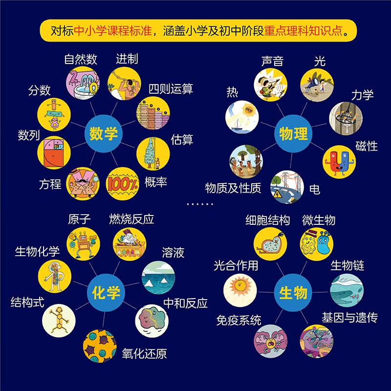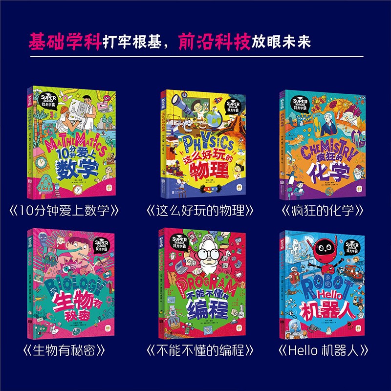 这是一套适合中国孩子阅读的学科启蒙绘本,共包含数学、物理、化学、生物、编程、机器人6大核心主题,涉及1200多个知识点。它立足于孩子们的实际课程,紧密联系中小学课程标准,将晦涩难懂的专业知识通过趣味故事和通俗易懂的语言讲给孩子们听,可以帮助孩子培养学霸思维,更好为以后的学习打下坚实的基础。