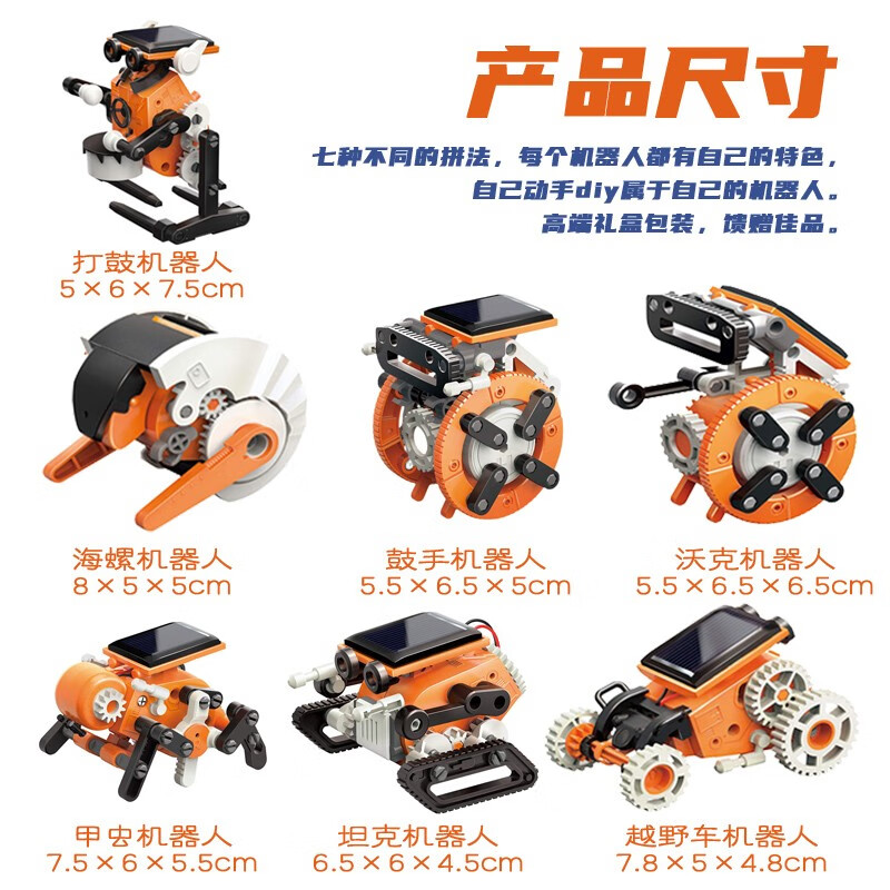 七种太阳能科教电动玩具,趣味拼装激发兴趣提升宝贝的动手能力,培养孩子学习光电转化原理太阳能供能驱动更环保。足量的光子激发太阳能板的硅原子而产生自由原子(负电)与电洞(正电),七合一自由拼装,在各种变化中都藏有不同的移动惊喜,能激发孩子们的丰富的想象力和创造力。两足、四足、六足、轮足,不管是哪种足都能走出无限可能。