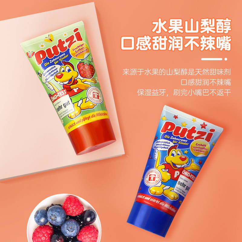Putzi 儿童防蛀牙膏可安全吞咽,加钙固齿,天然果味牙膏,特别强化钙元素,强健宝宝尚未完全发育的乳牙,清除牙菌斑 有效防止龋齿。同时不含薄荷成分,不刺激宝宝味觉,让孩子爱上刷牙。
