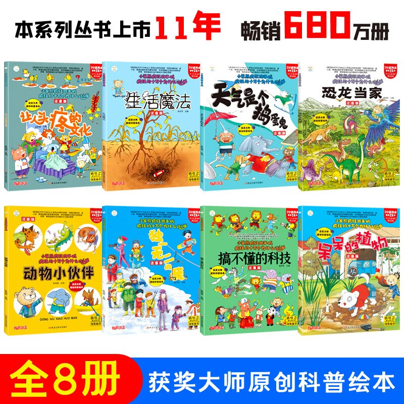 这是一套获奖大师原创科普绘本,用轻松幽默的故事讲述科普知识。专门针对3-6岁孩子策划,全套8册,分为8大主题,由4位出版界大咖花费3年时间倾力打造,内容涉及动物、植物、恐龙、天气、人体、生活、科技、文化八大热点领域。