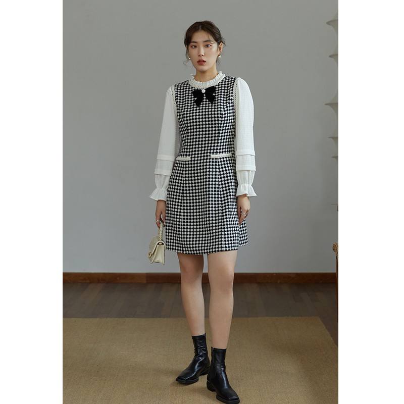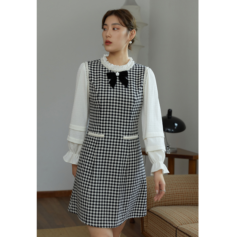 DUSHU 独束 女士拼接假两件连衣裙 21DS3535,打造JNG致小脸,是大脸妹妹的福音,后腰牛筋+系带收腰,里布设计,穿着舒适无束缚感,贴身穿着亲肤舒适。