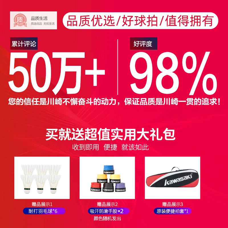 川崎(KAWASAKI)推出的这款羽毛球拍,拍身长度约为675mm,拍身重量约为95-200g,轻巧便携。选用凹槽护线拍框,可减少空气阻力,保护羽拍线。碳素中杆握感舒适,可增加击球威力和扣杀速度。同时采用T型接头,加强接球稳定性。